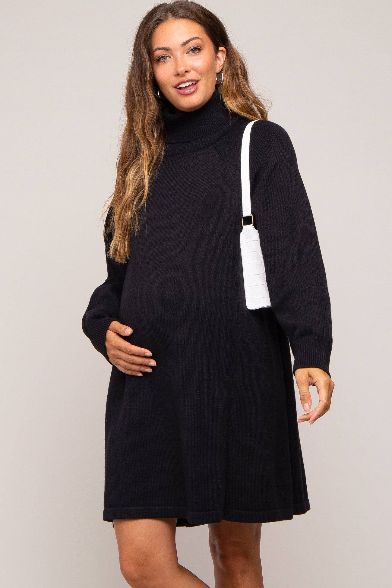 Elevate your maternity style with our Turtleneck Long Sleeve Maternity Sweater Dress. Crafted from a soft, stretchy knit, this dress gently hugs your growing bump, providing comfort and a flattering silhouette throughout pregnancy and beyond. The classic turtleneck and long sleeves keep you cozy, while the elegant design offers endless styling possibilities—from casual daywear with sneakers to chic evenings with boots. Designed to grow with you, this sweater dress is a versatile closet staple for expecting moms who love effortless elegance and unbeatable comfort.