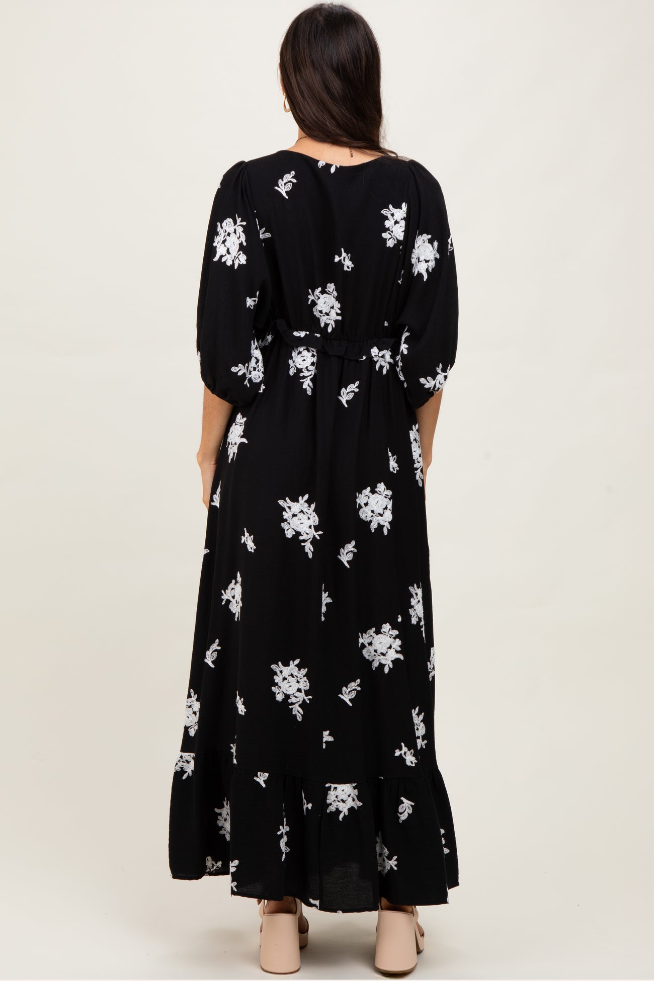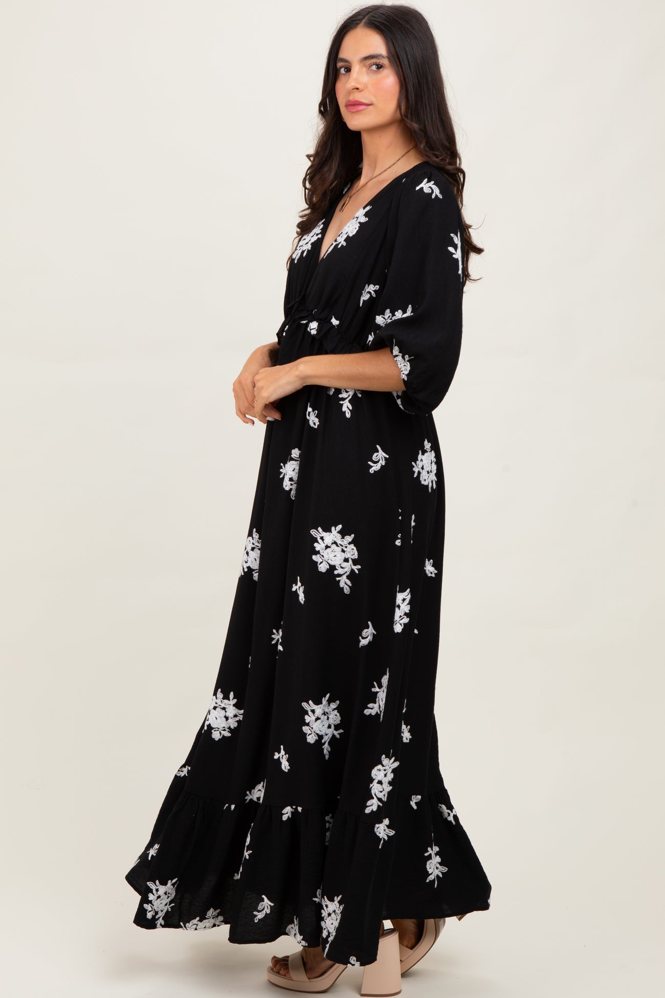 Black Vintage Floral Embroidered V-Neck 3/4 Sleeve Maxi Dress