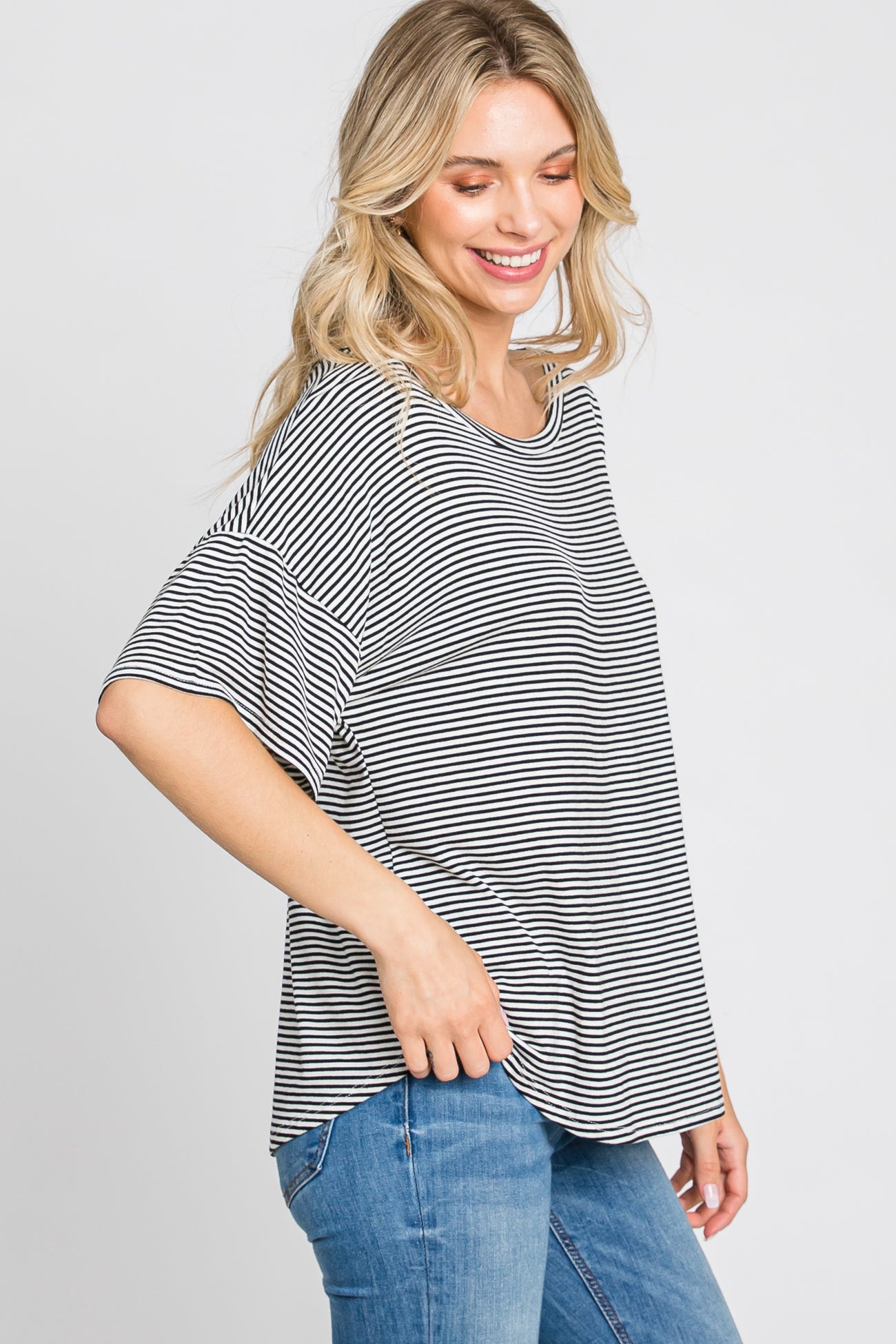 Details A striped top featuring short sleeves, a rounded neckline and a curved hem. Content + Care