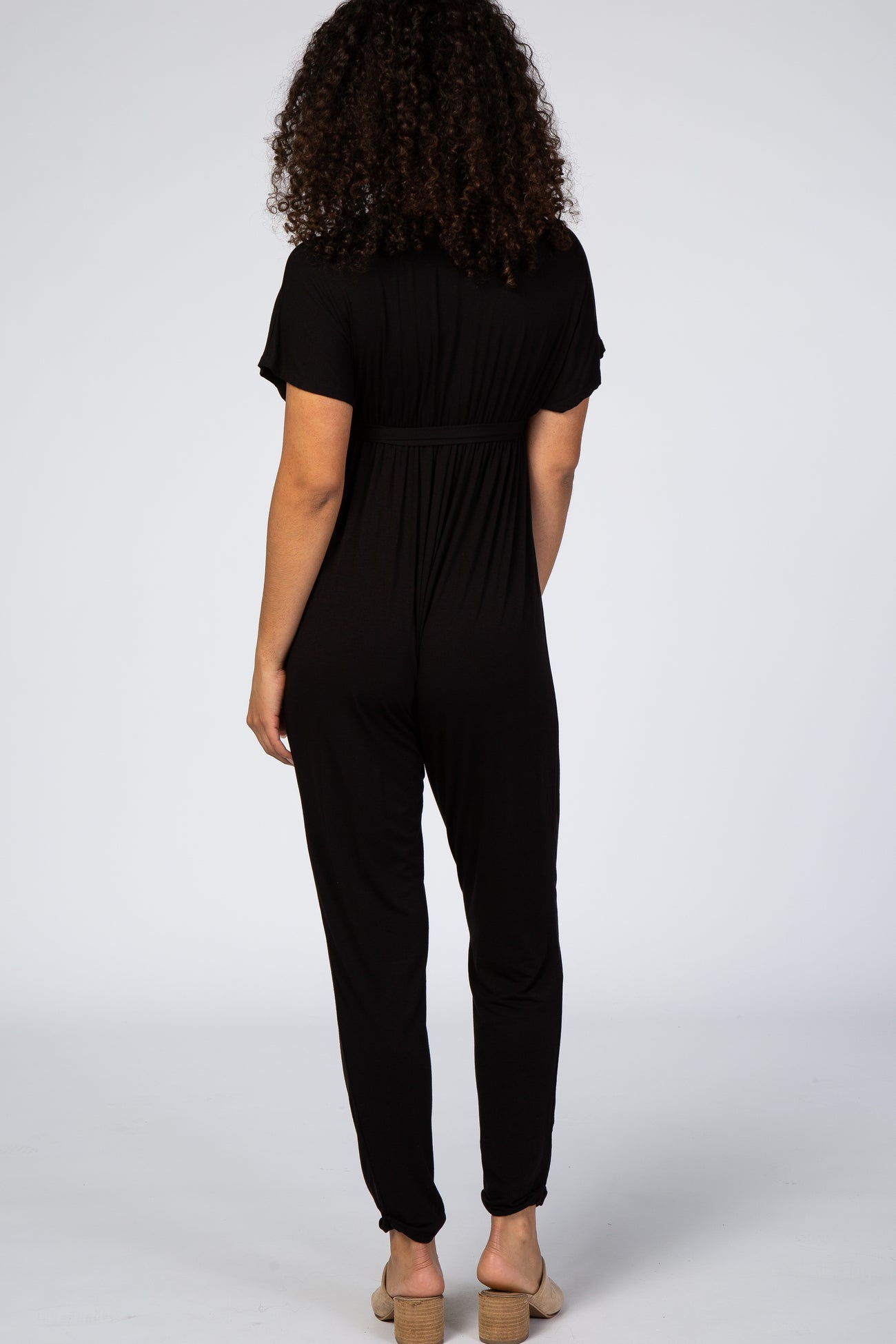 A solid hued jumpsuit featuring short dolman sleeves, a v-neckline with wrap accent, a cuffed, tapered leg style, and a sash tie.