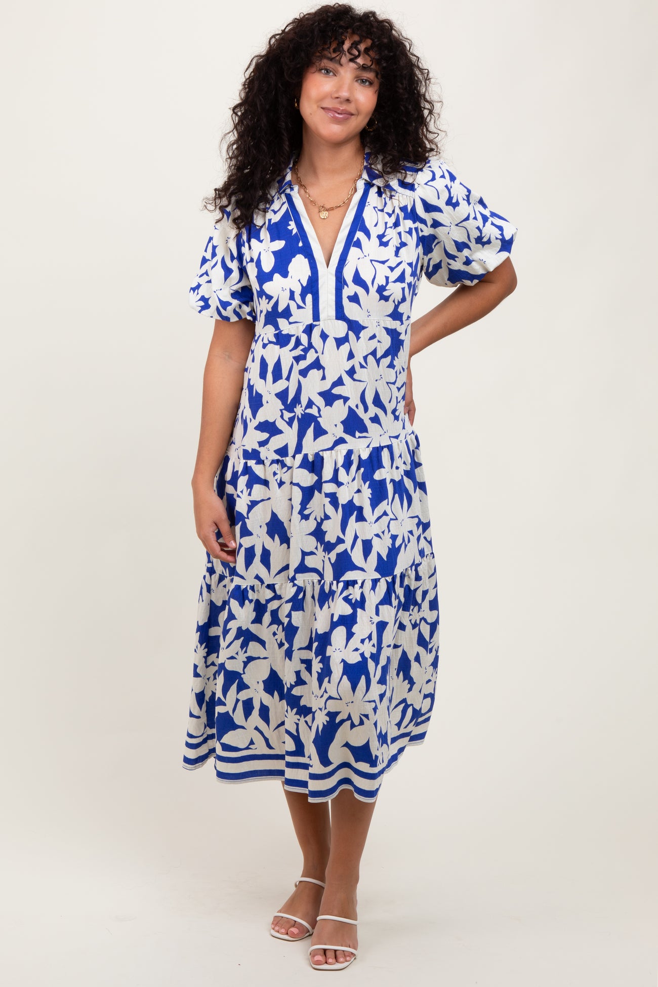 Blue Botanical Print A Line Tiered Dress