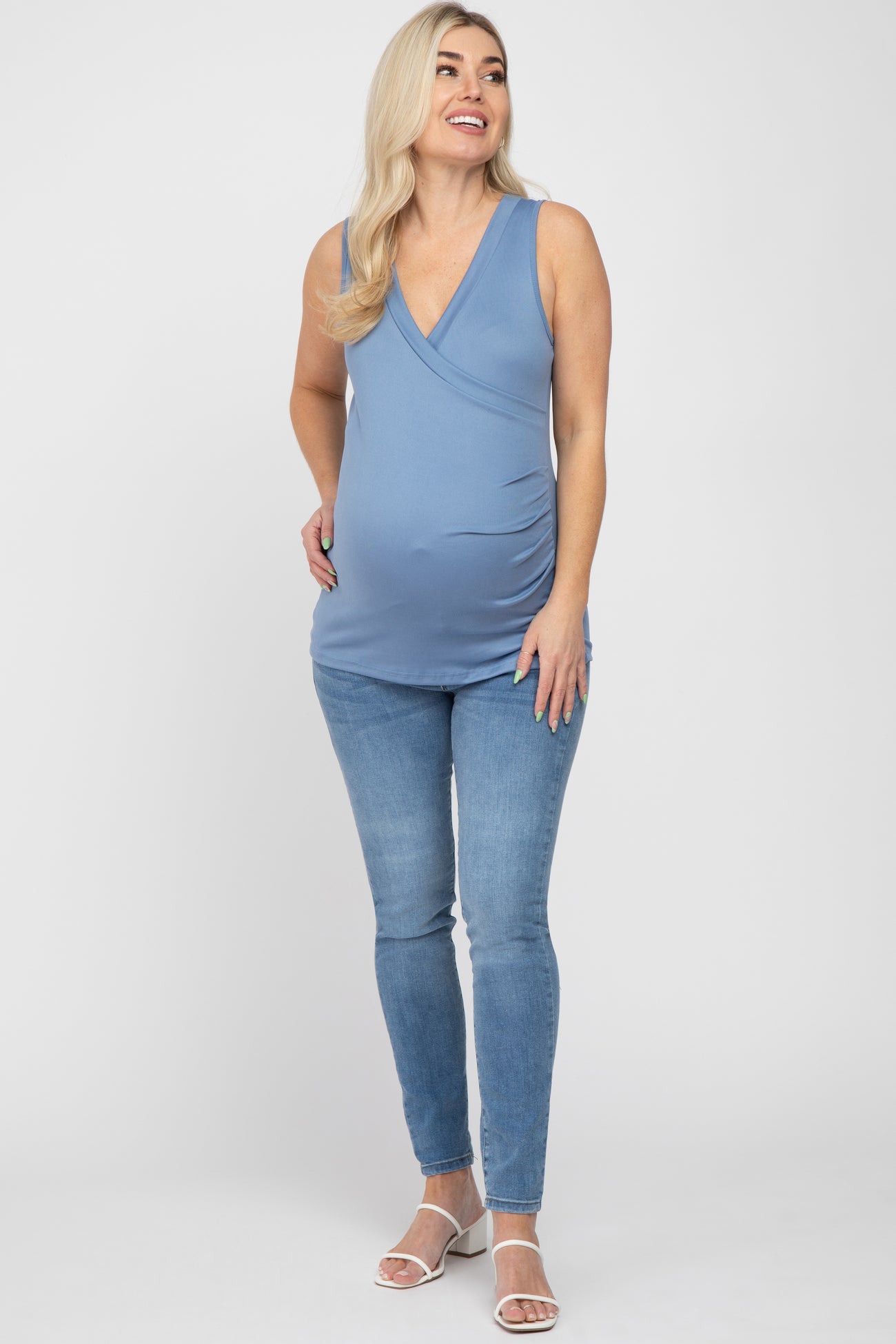 A sleeveless maternity nursing top. Features crossover neckline and side ruching.
