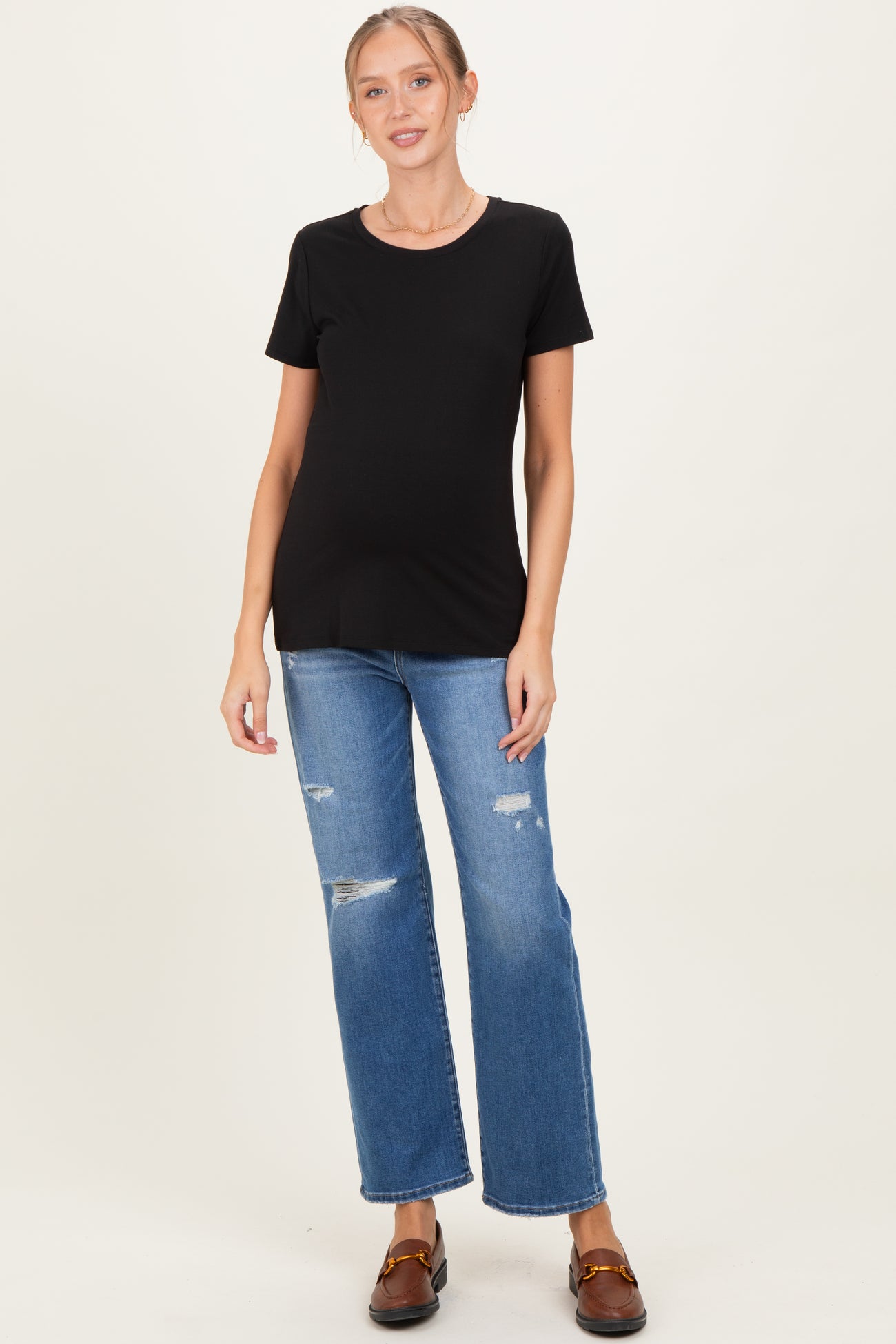 Experience comfort and style with these distressed ripped knee maternity jeans, designed to grow with you throughout pregnancy. Featuring a straight leg cut, these jeans offer a relaxed fit that flatters every trimester. The soft, stretchy fabric provides all-day comfort while the ripped knee details add an edgy, fashionable touch. A supportive waistband gently hugs your baby bump without compromising on style. Perfect for casual outings or laid-back weekends, these maternity jeans pair effortlessly with your favorite tops and shoes. Embrace a cool, modern look without sacrificing comfort during your pregnancy journey.