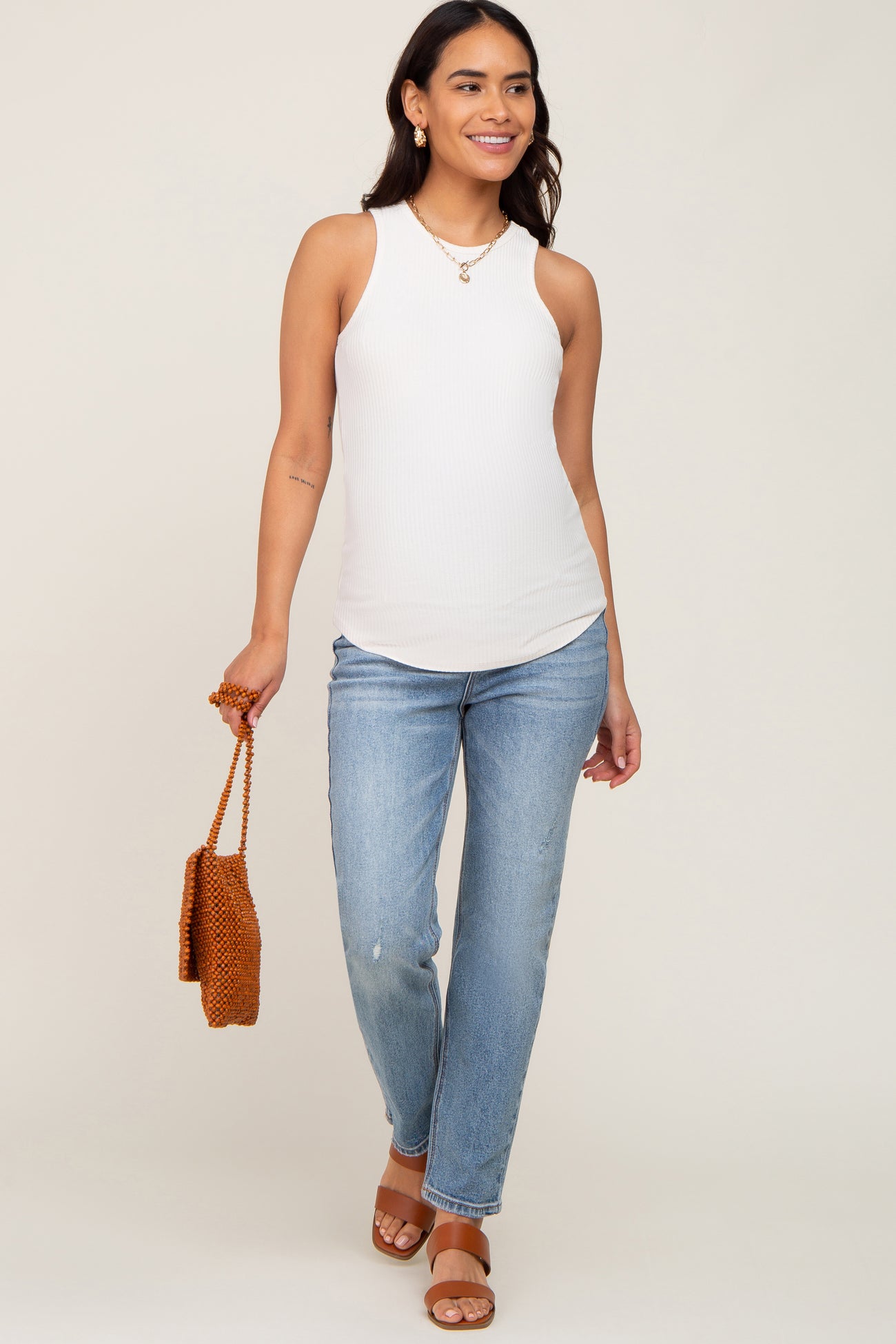 A pair of medium wash maternity straight leg jeans with five pockets, light distressing, and a full panel elastic belly band. Material has little stretch.