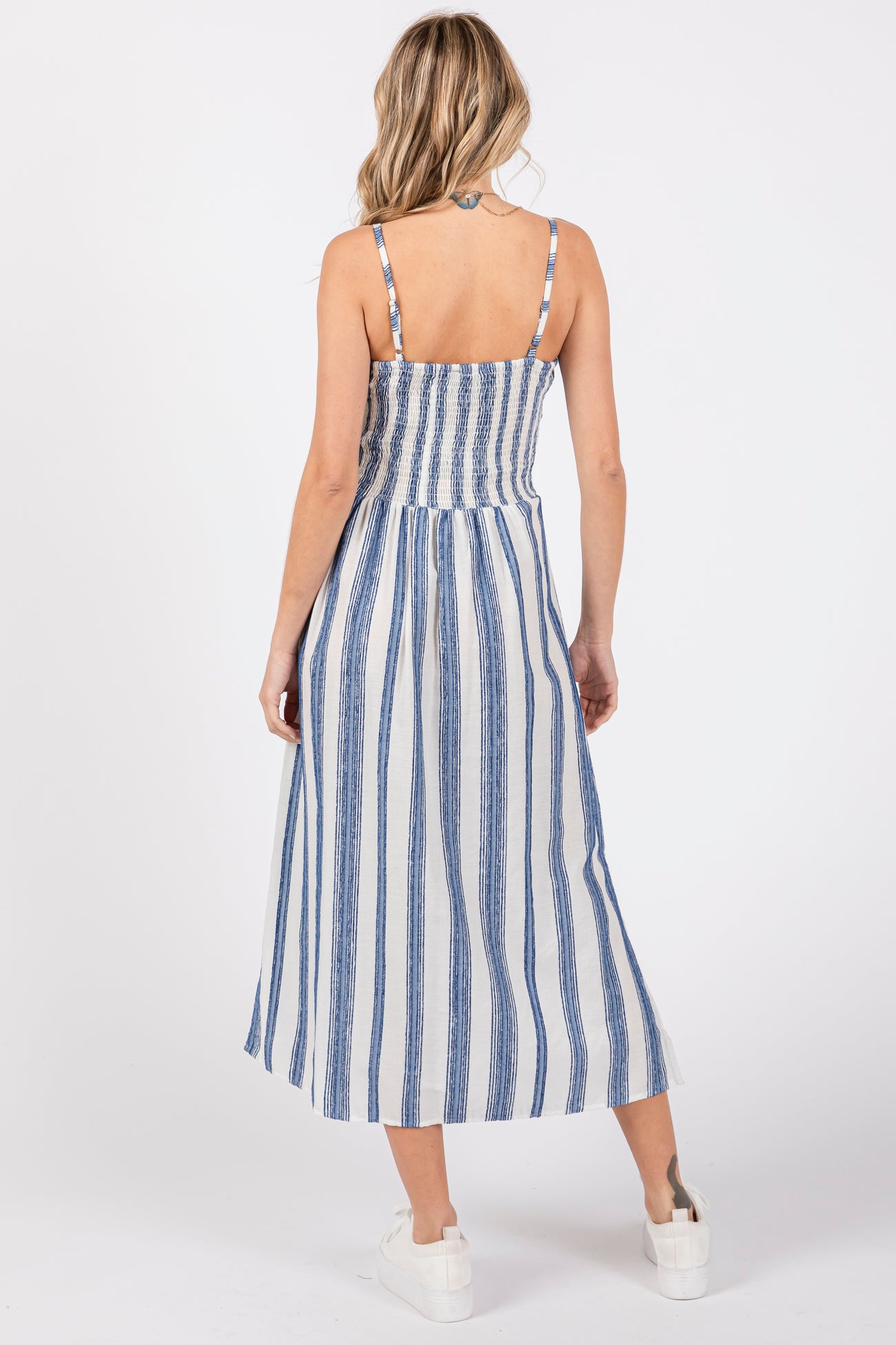 An embroidered stripe midi dress featuring a v-neckline, a knot front, a cutout under the bust, adjustable straps, smocked back and side slits.