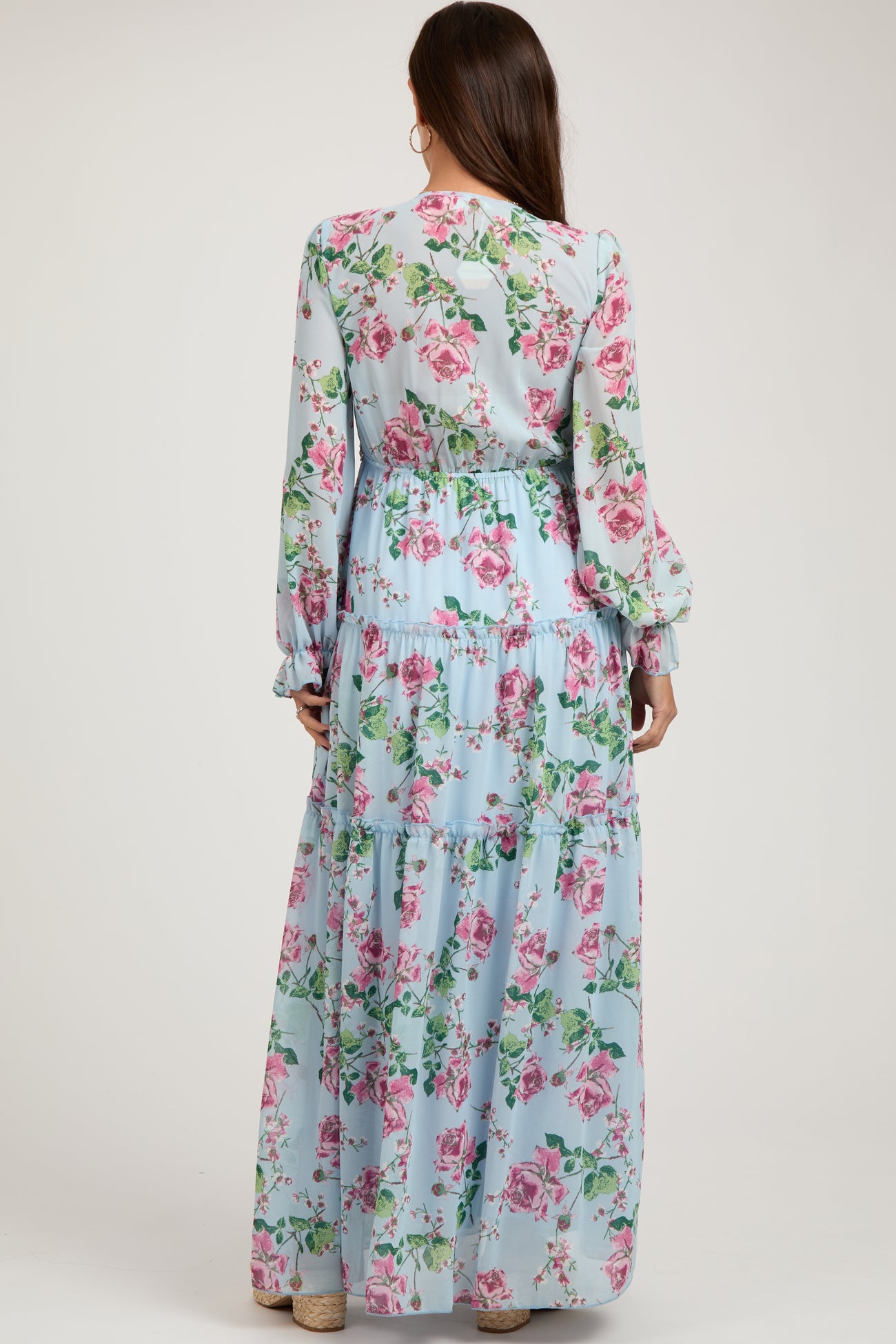 A floral chiffon maternity maxi dress featuring a v-neckline, long puff sleeves, a tiered skirt with lettuce edge trim and double lining.