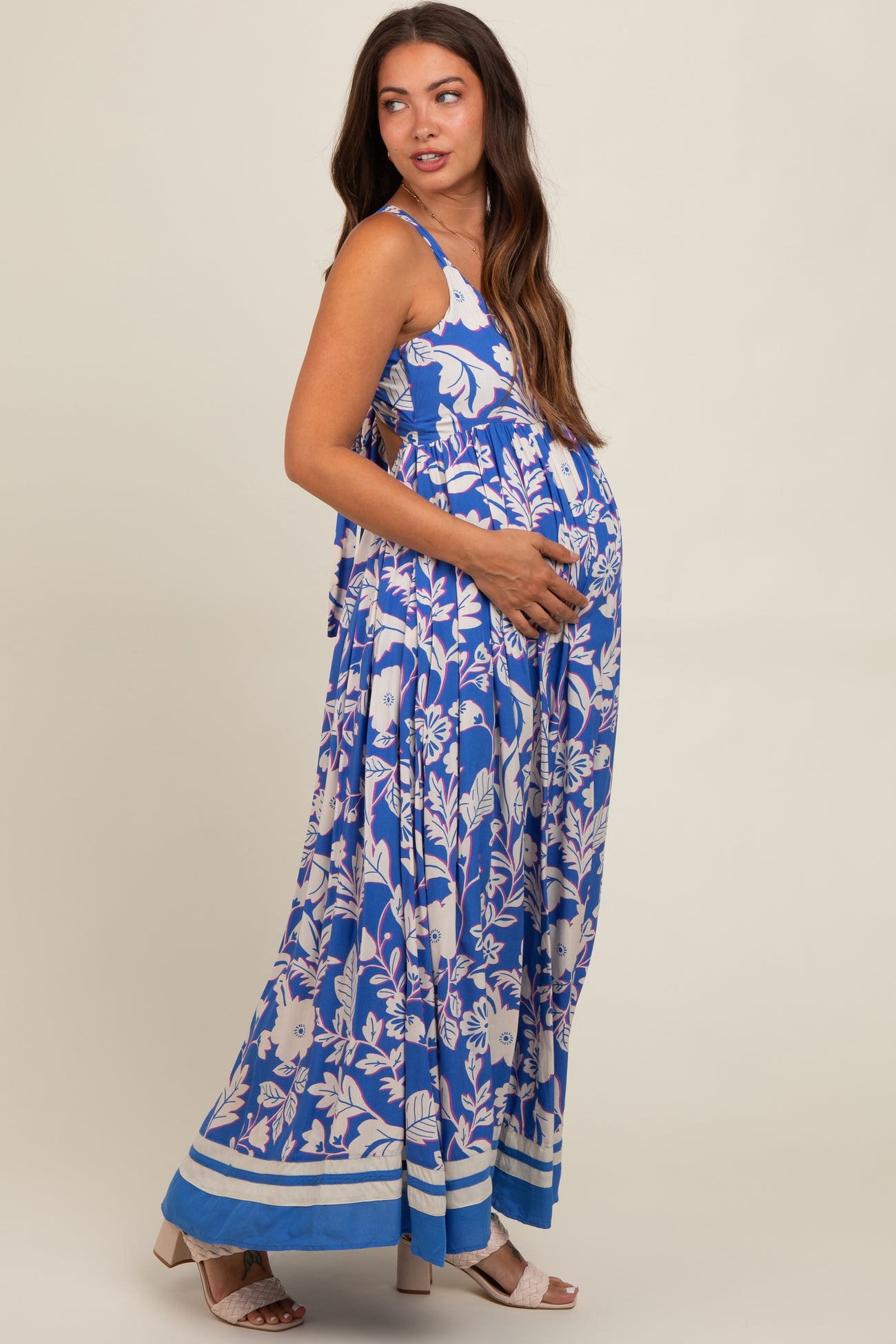 Blue Floral Cutout Back Tie Maternity Maxi Dress