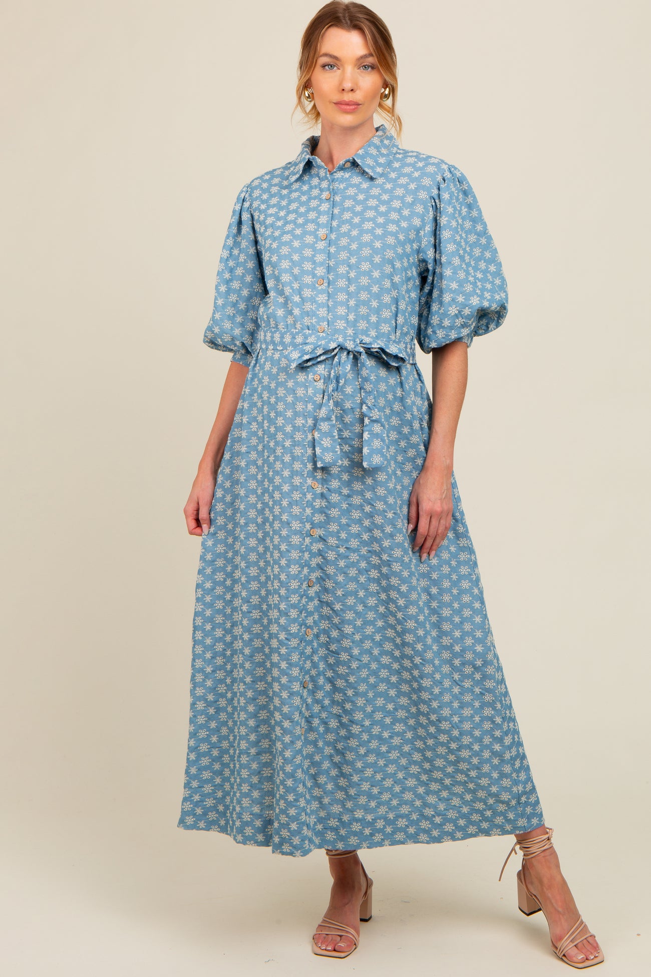 Blue Floral Embroidered Button Down Chambray Maternity Maxi Dress