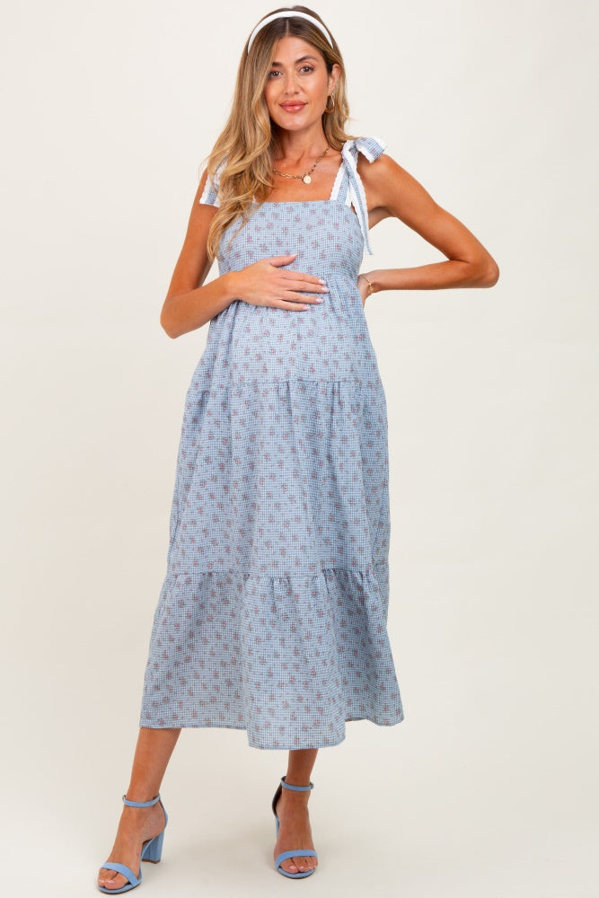 Blue Floral Gingham Shoulder Tie Maternity Midi Dress