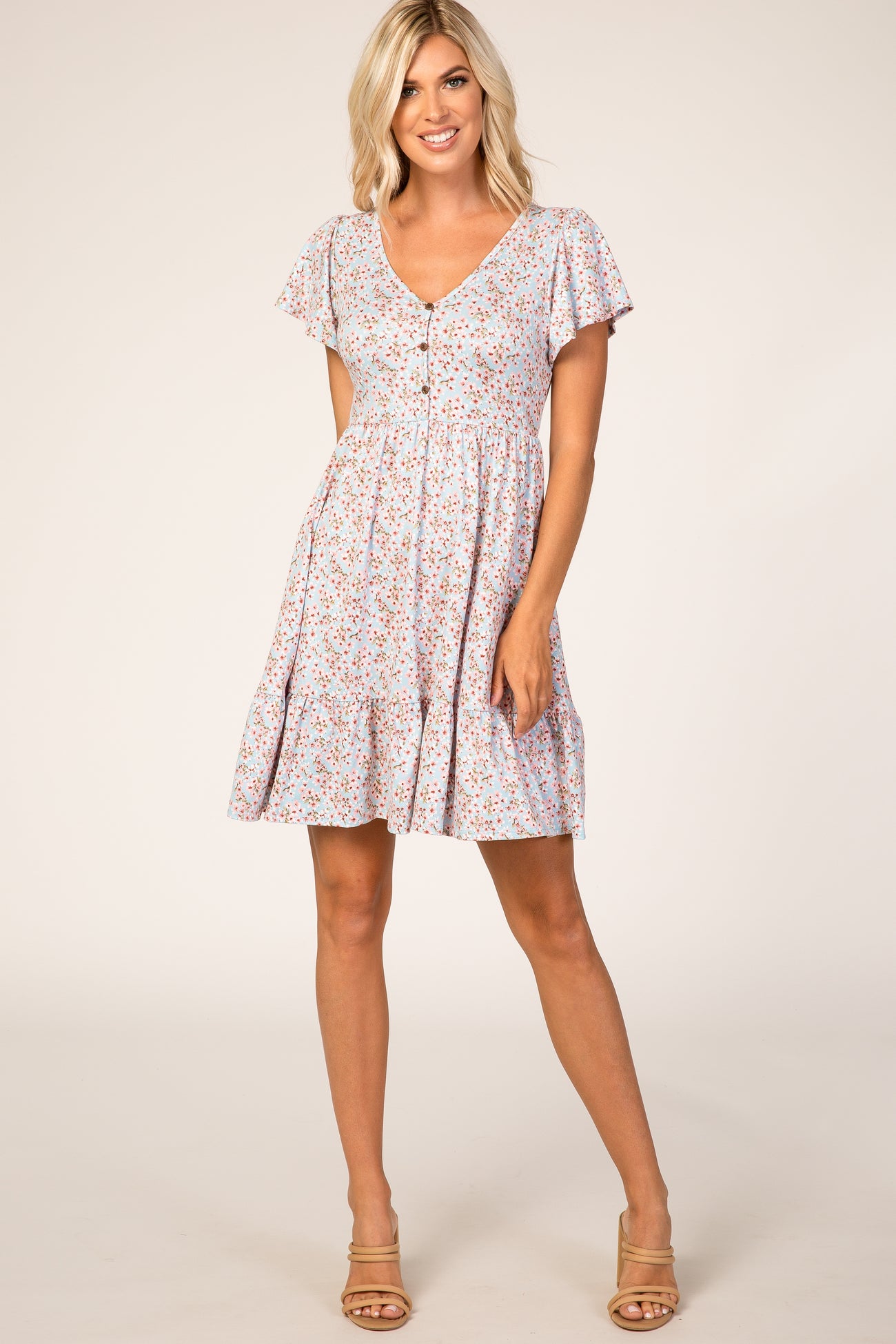 A floral dress with ruffle accents on the sleeves and hem featuring an elastic empire waist and button details.