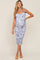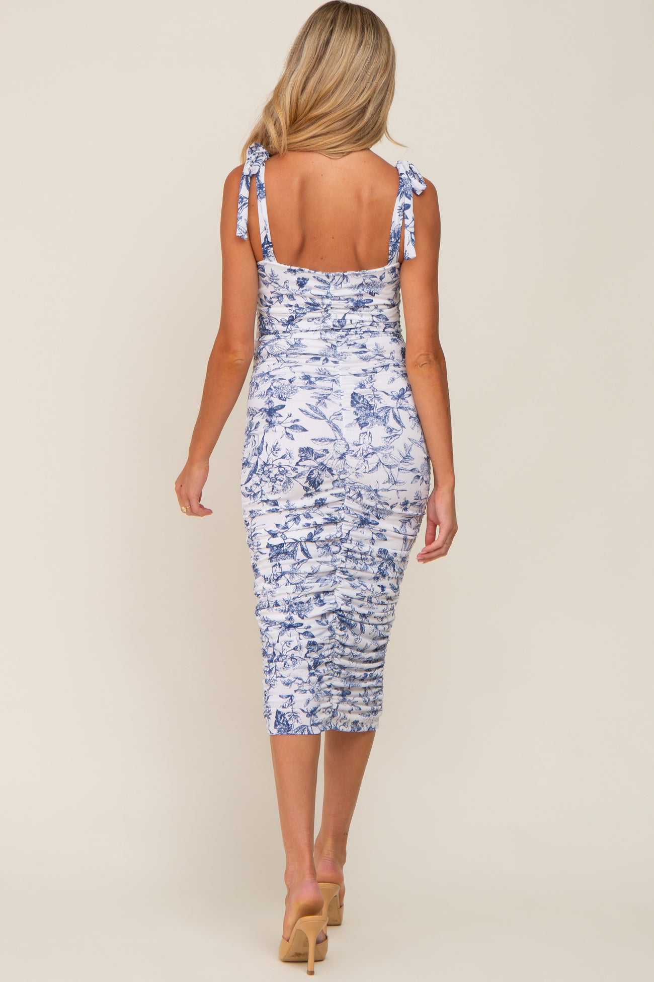 Blue Floral Shoulder Tie Ruched Maternity Midi Dress