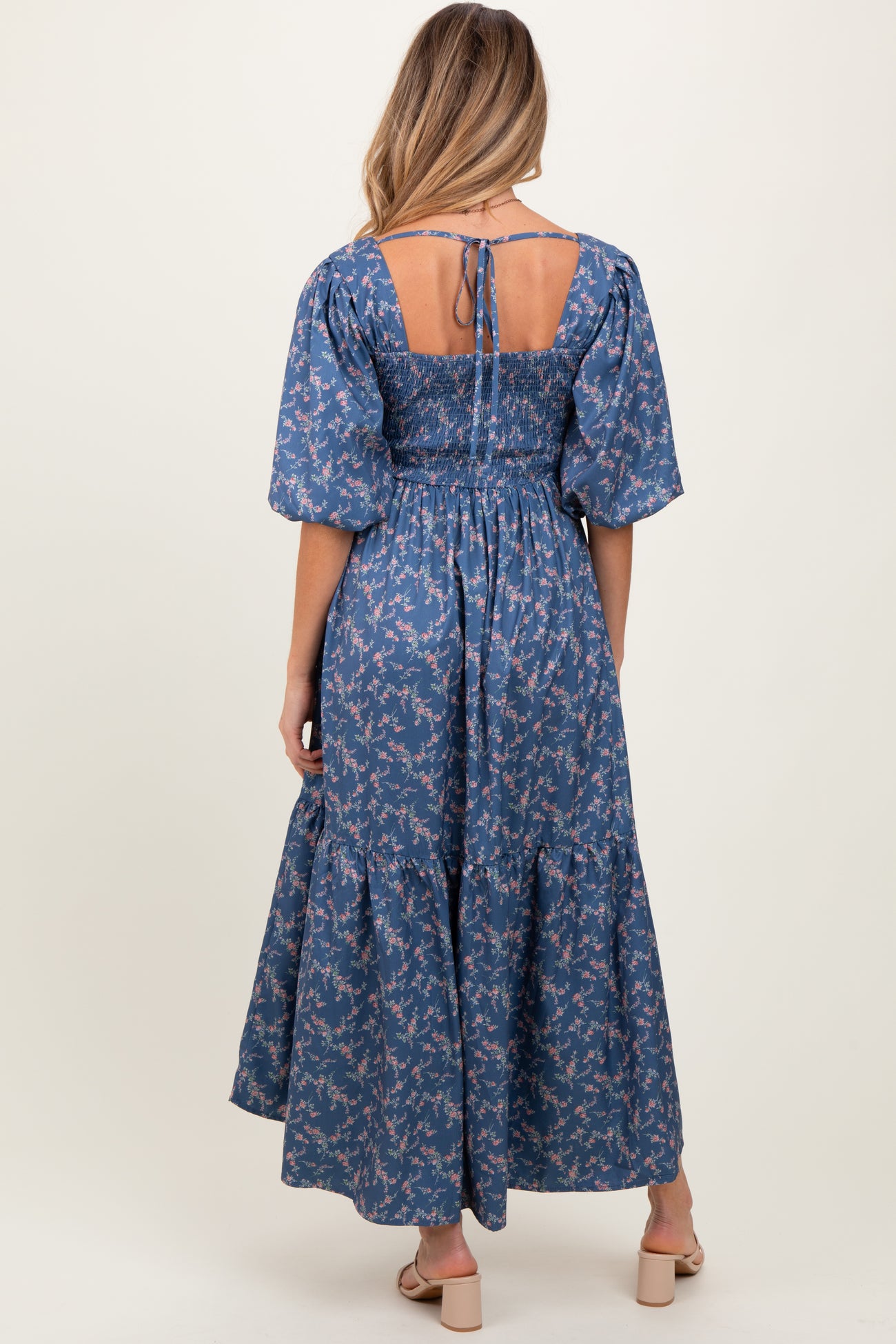 Blue Floral Smocked Hi-Low Puff Sleeve Maternity Maxi Dress