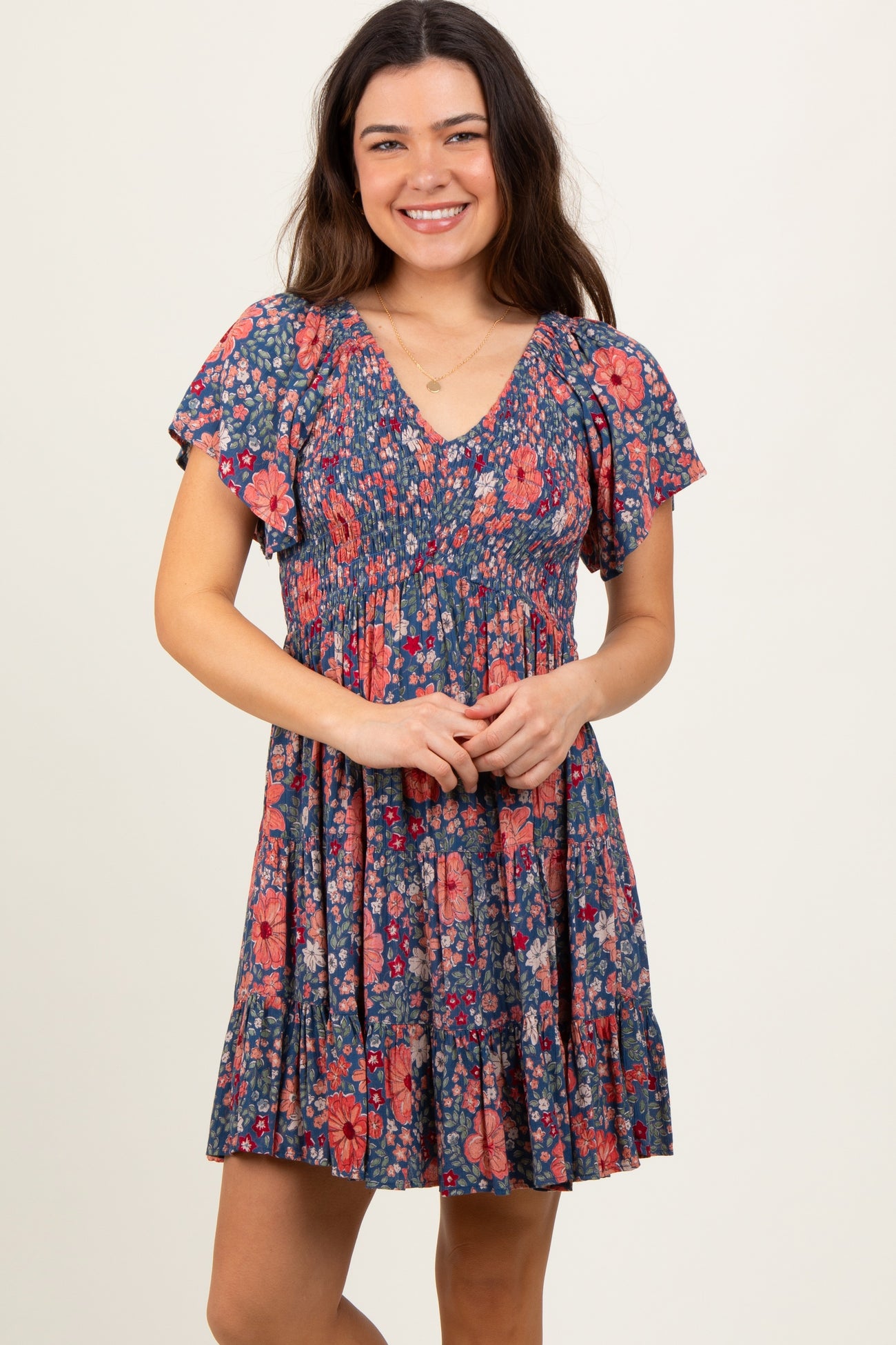 Blue Floral Smocked V-Neck Flutter Sleeve Dress