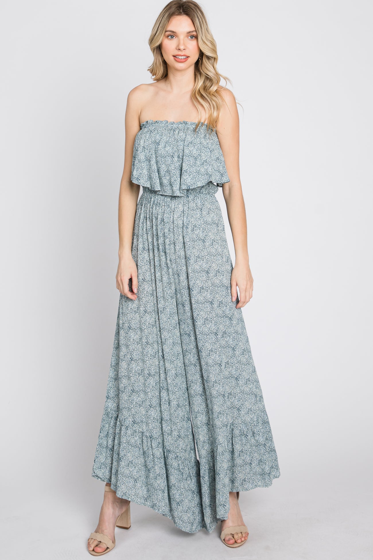 Blue Floral Strapless Ruffle Hem Jumpsuit