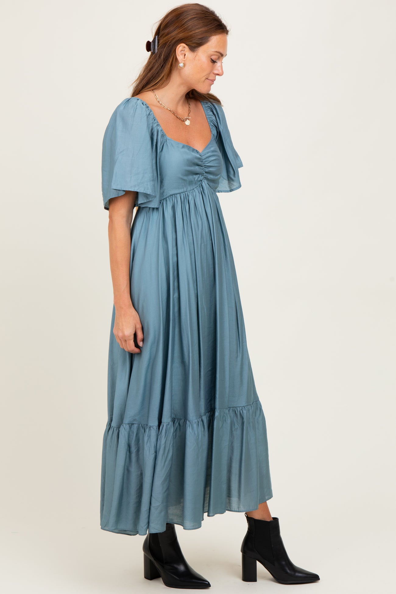 Step into effortless elegance with our Blue Flutter Sleeve Ruffle Hem Midi Dress. Crafted from a soft, flowing fabric in a serene blue shade, this dress features flutter sleeves and a ruched sweetheart neckline that flatters every silhouette. The midi length with a charming ruffle hem adds a touch of feminine grace, while convenient side pockets blend practicality with style. Perfect for weddings, brunches, or weekend outings, this dress pairs beautifully with boots or sandals. Embrace comfort and chic sophistication all in one stunning piece. Elevate your wardrobe today!