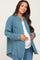 A solid maternity top featuring long sleeves, a curved frayed hem, front pockets, a button down front, and a collared neckline.