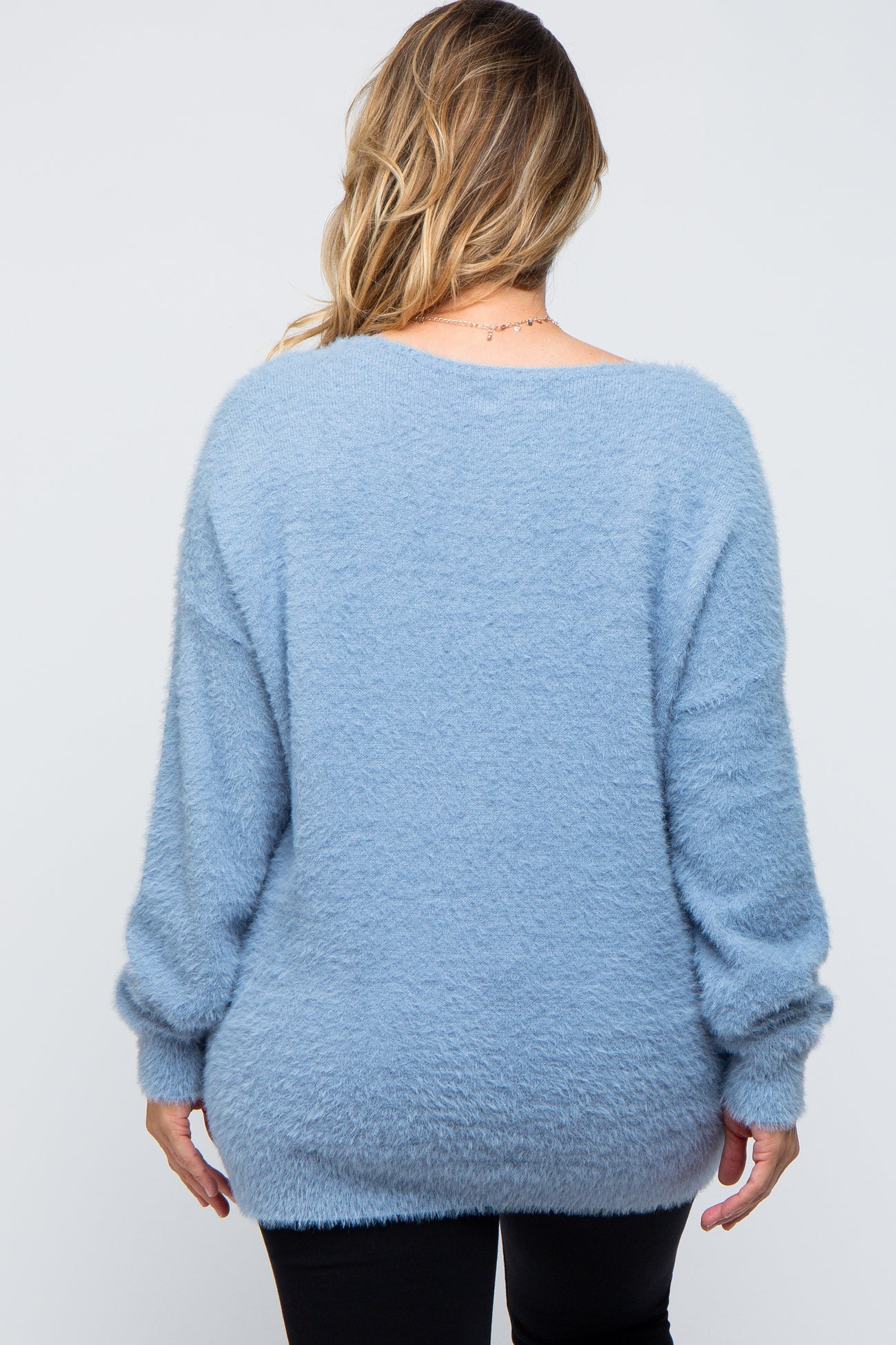 Blue Fuzzy Knit Boat Neck Maternity Plus Sweater