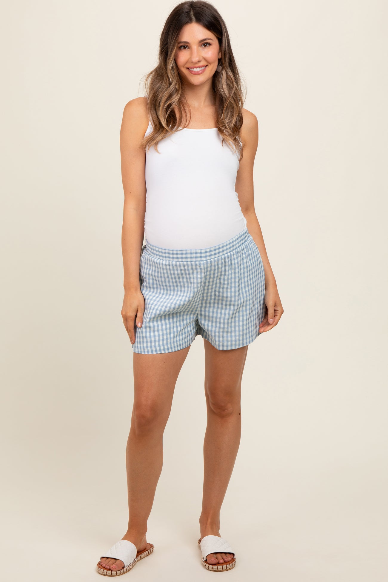 Blue Gingham Front Pocket Maternity Shorts