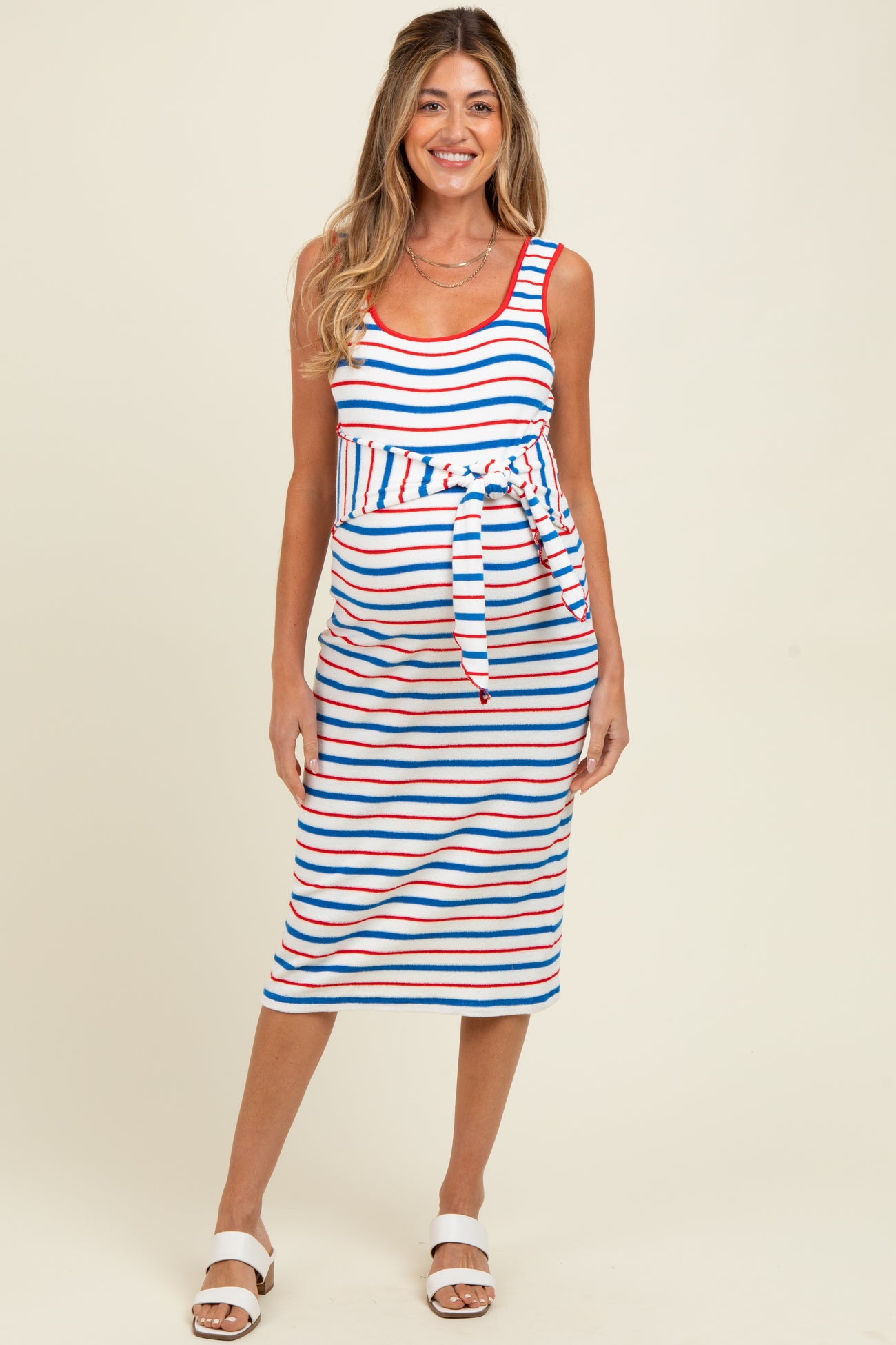 Blue Multi Striped Sleeveless Maternity Midi Dress