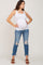 A medium wash pair of maternity straight leg jeans with distressed open knees, fringe hem, five pockets and full panel elastic bellyband. Material has medium stretch.