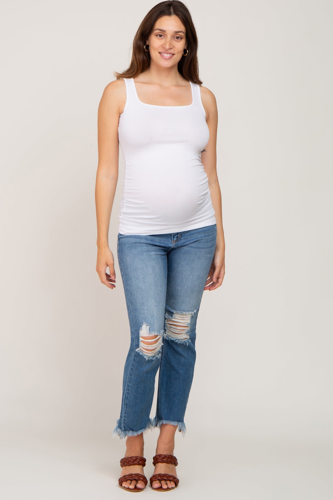 Blue Open Knee Fringe Hem Maternity Straight Leg Jeans
