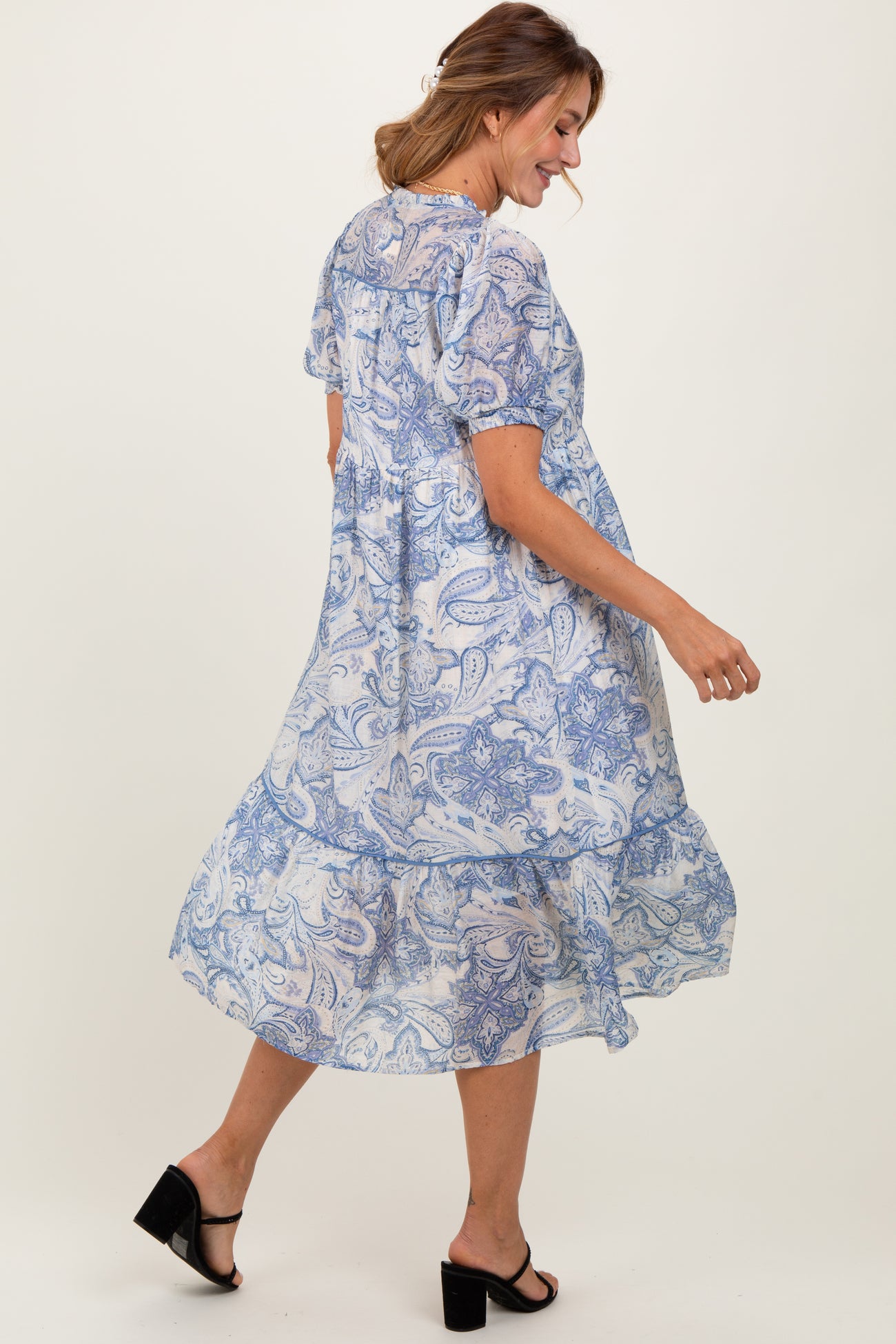 Embrace effortless style with this paisley midi dress, featuring a flattering front tie and delicate ruffle trim for a feminine touch. The dress boasts puff sleeves with elastic cuffs, adding a playful volume while maintaining comfort. Crafted with a lightweight, flowy fabric, it offers a breezy feel perfect for warm days or casual outings. The midi length and relaxed fit create an elegant silhouette that moves beautifully with every step. Pair this versatile dress with your favorite sandals or heels for an easy, chic look that’s ideal from brunch to evening gatherings.