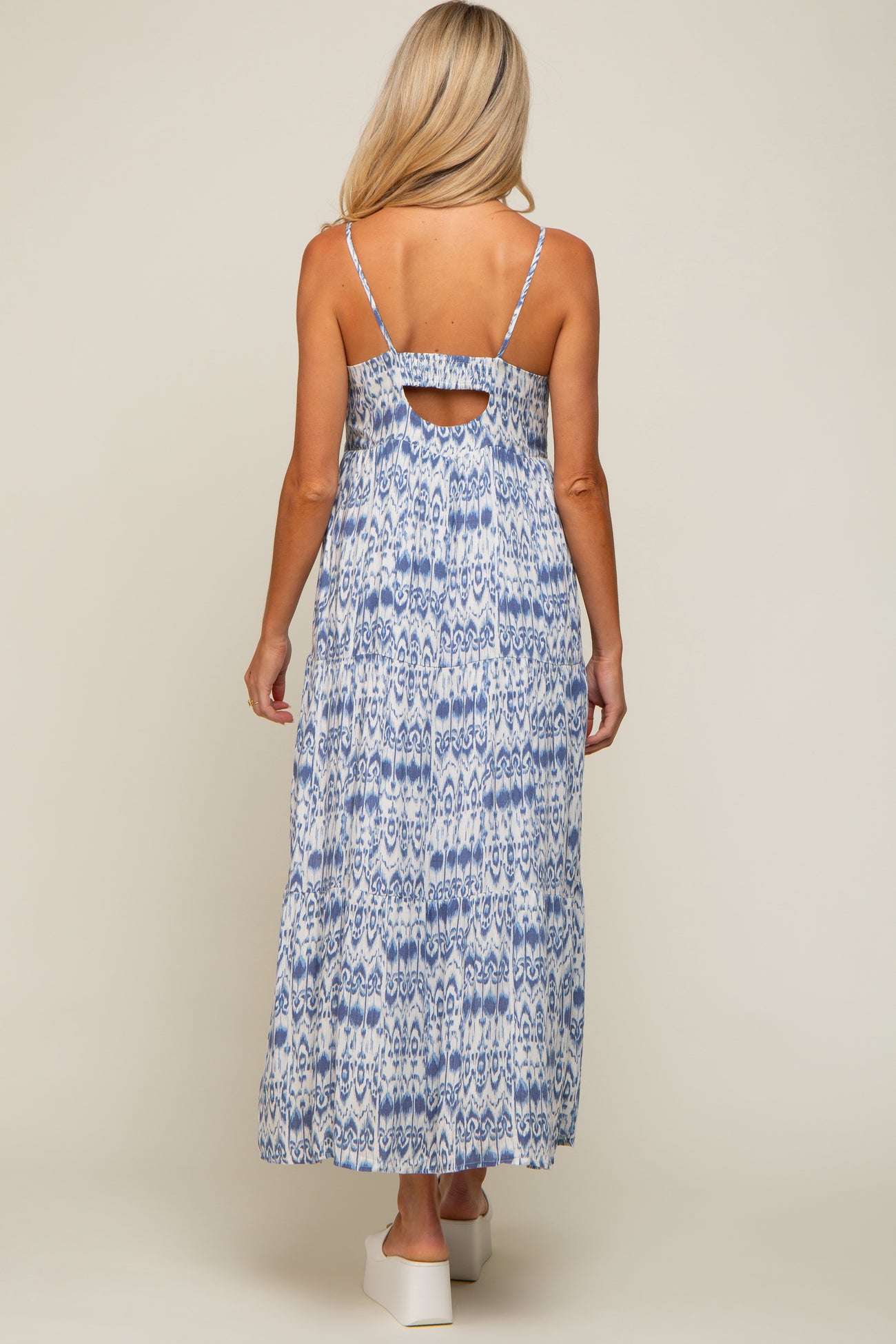 A printed maternity maxi dress featuring a straight neckline, a smocked back, a tiered body, and a back cutout. The front tie adjusts the straps.