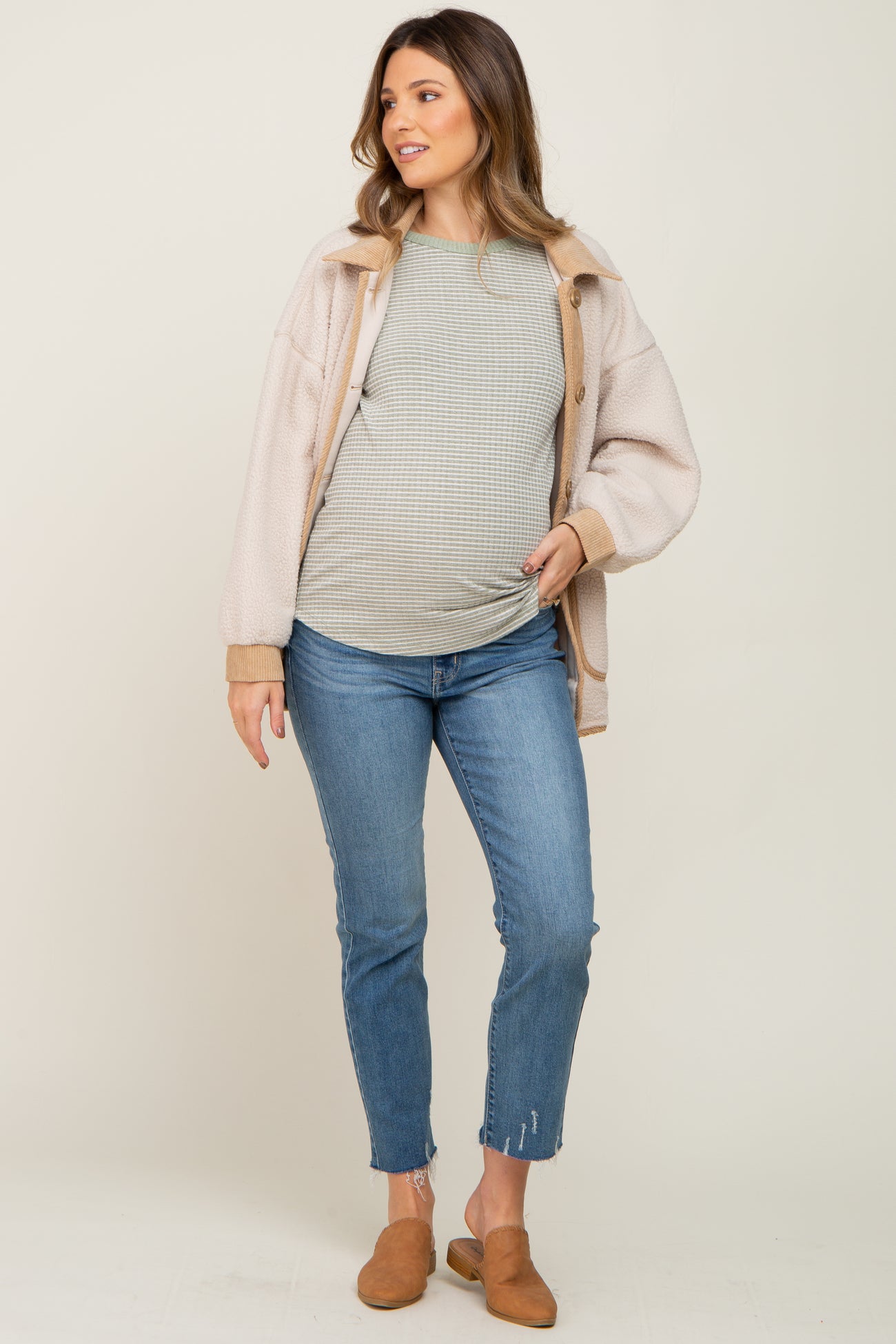 A pair of straight maternity jeans featuring five pockets, slight distressed accents throughout, a raw hem, and full panel belly band.