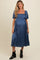 Blue Satin Pleated Bodice Puff Sleeve Maternity Midi Dress