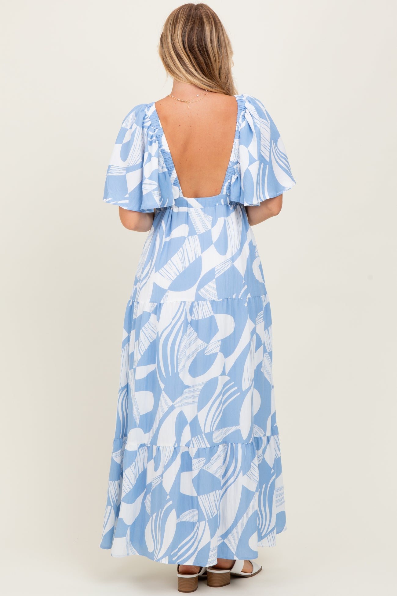Elevate your summer wardrobe with this Blue Sleeveless Smocked Back Printed Maxi Dress. Featuring a captivating abstract print in soft blue and white, this dress offers a breezy and elegant look perfect for any occasion. The deep V-neckline is complemented by flutter sleeves that add a touch of femininity, while the smocked back ensures a comfortable, flattering fit. Its tiered, flowing maxi skirt creates effortless movement, making it ideal for beach days, garden parties, or casual outings. Pair with sandals or wedges for a chic, laid-back vibe. Light, breathable, and stylish—your go-to dress this season!