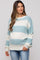 A striped maternity sweater with a rounded neckline and long drop shoulder sleeves. Sweater is partially brushed. Ribbed accents along the neckline and sleeve cuffs.