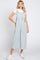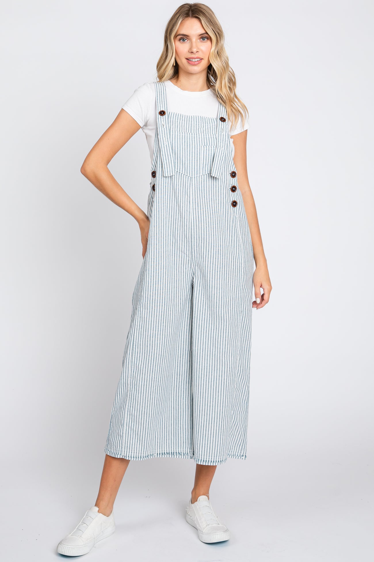 A pair of striped linen overalls featuring adjustable button straps, a front pocket, side buttons and wide crop hem with fringe trim.