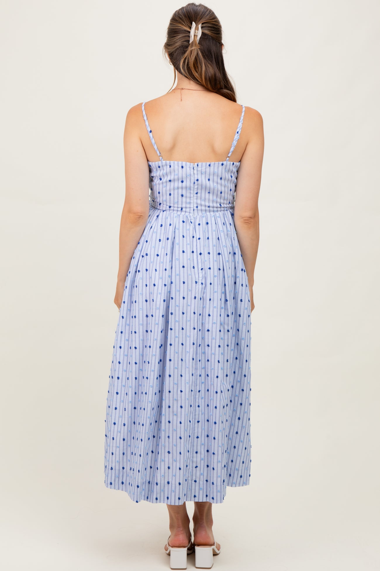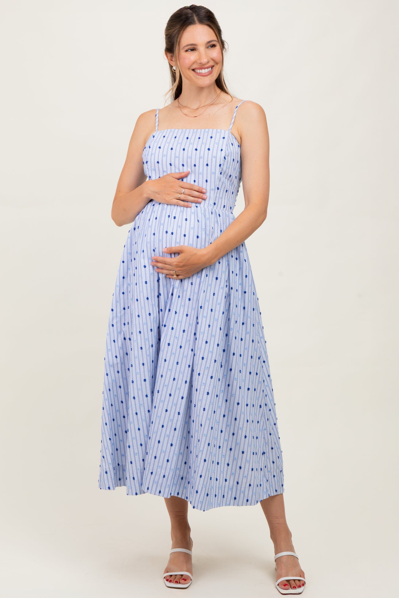 Blue Striped Swiss Dot Sleeveless Maternity Midi Dress