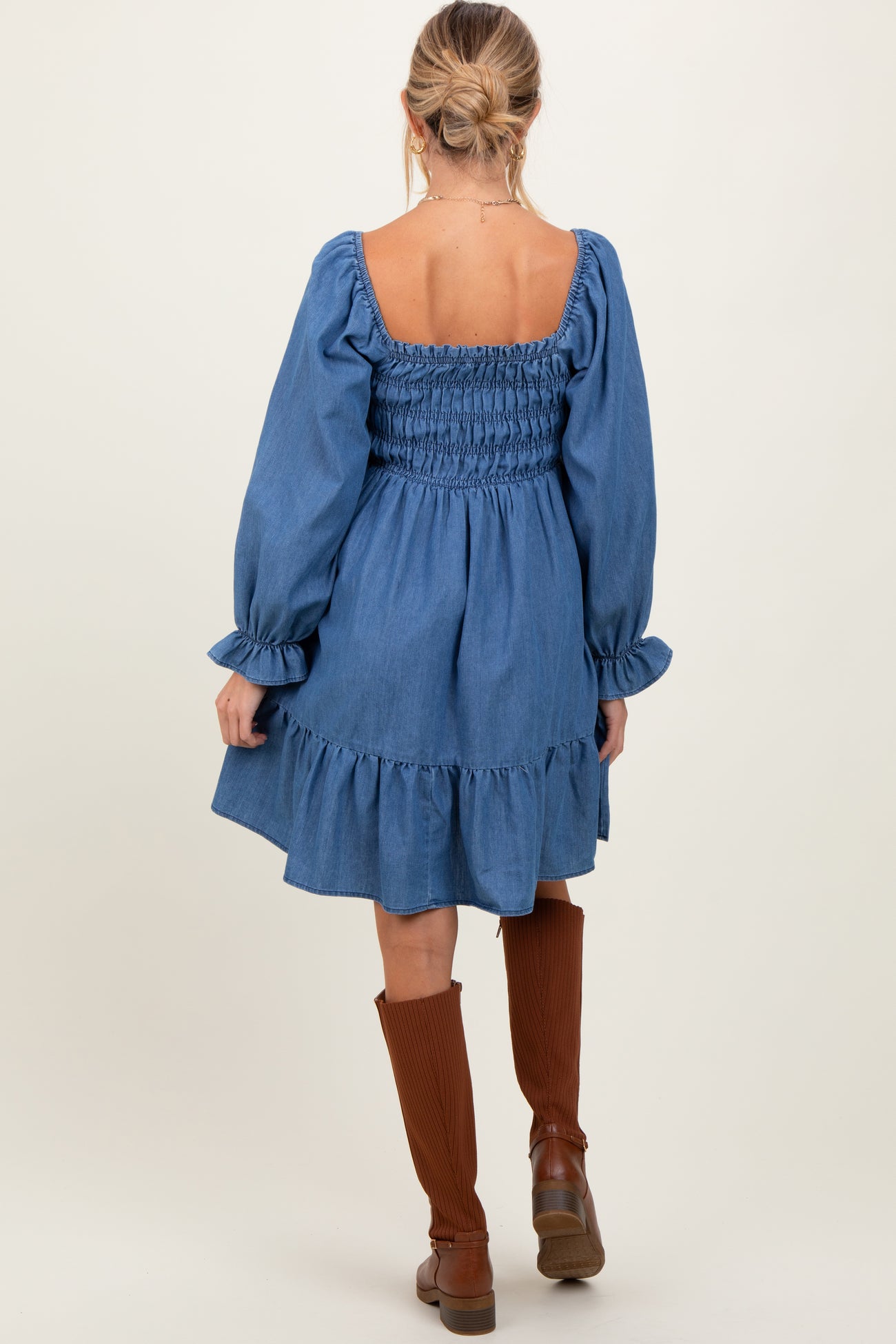 Embrace effortless style with our Blue Vintage Wash Chambray Smocked Maternity Midi Dress. Crafted from soft chambray fabric, this dress features a flattering smocked bodice that stretches beautifully to accommodate your growing bump. The square neckline and long puff sleeves add a touch of vintage charm, while the tiered midi skirt offers a comfortable and breezy fit. Perfect for casual outings or special occasions, this versatile maternity dress pairs effortlessly with boots or sandals. Stay stylish and comfortable throughout your pregnancy with this timeless, must-have dress.