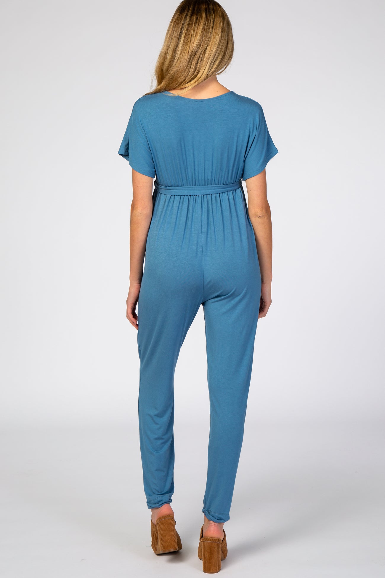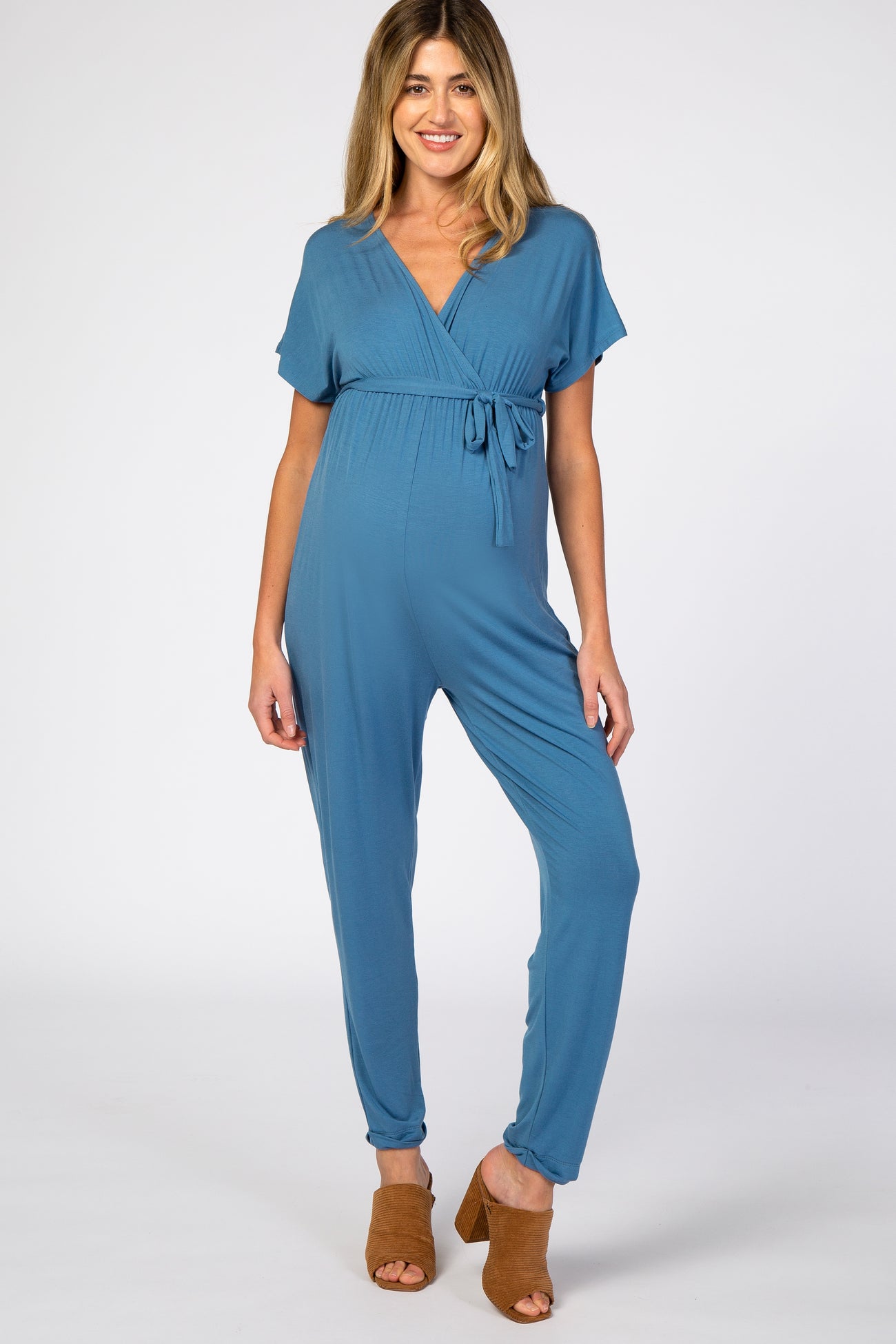 A solid hued maternity jumpsuit featuring short doman sleeves, a v-neckline with wrap accent, a cuffed, tapered leg style, and a sash tie.