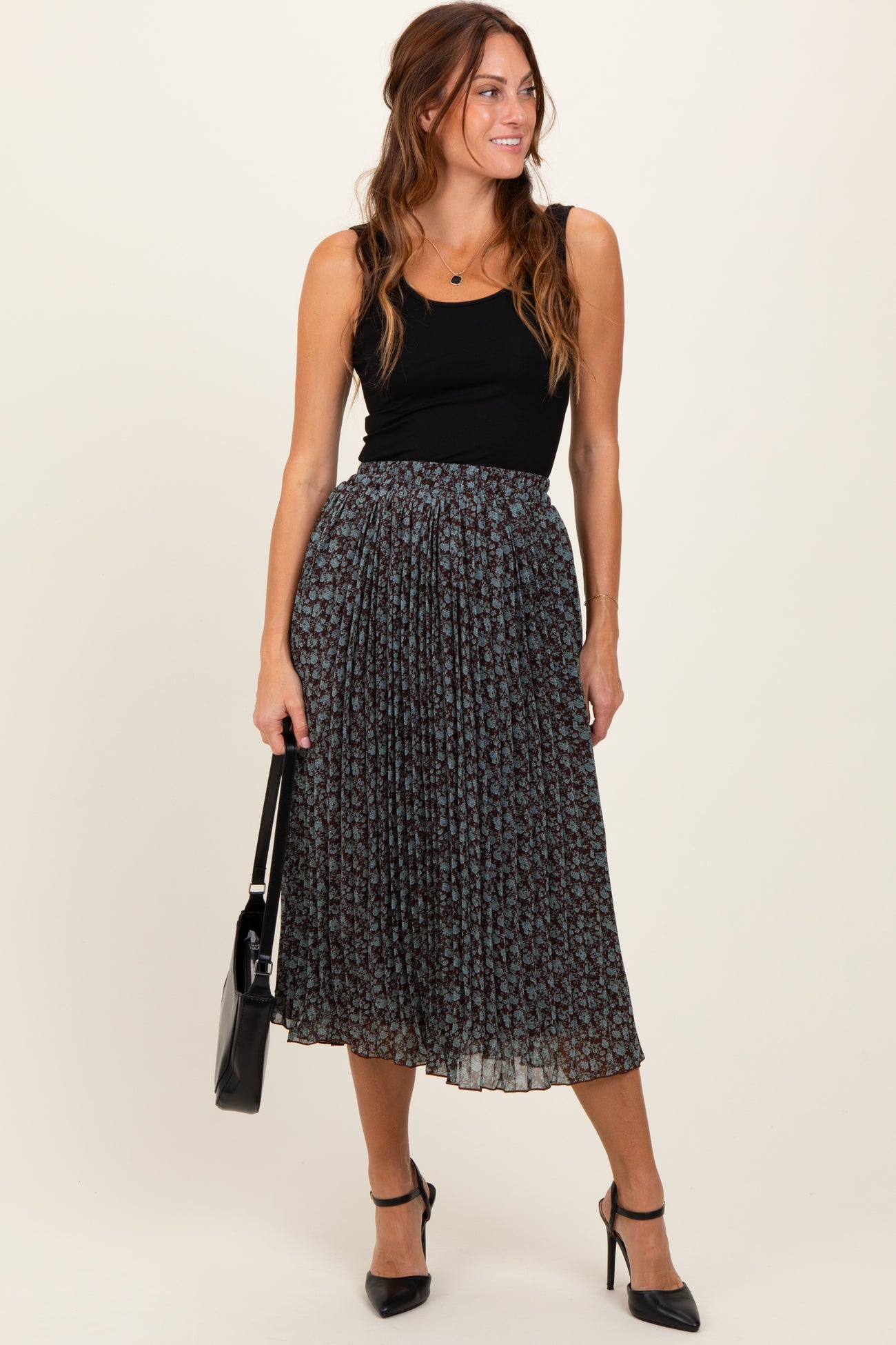 Brown Floral Print Chiffon Pleated Midi Skirt