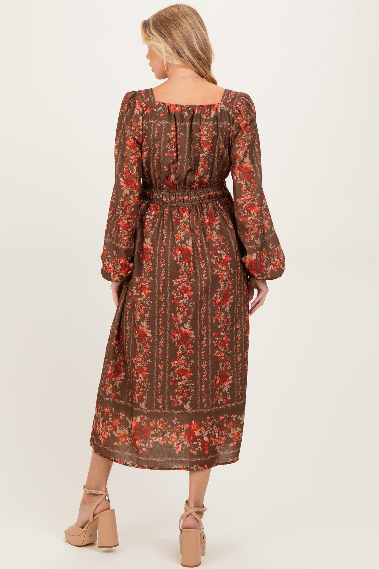 Brown Floral Stripe Button Down Long Sleeve Maternity Midi Dress