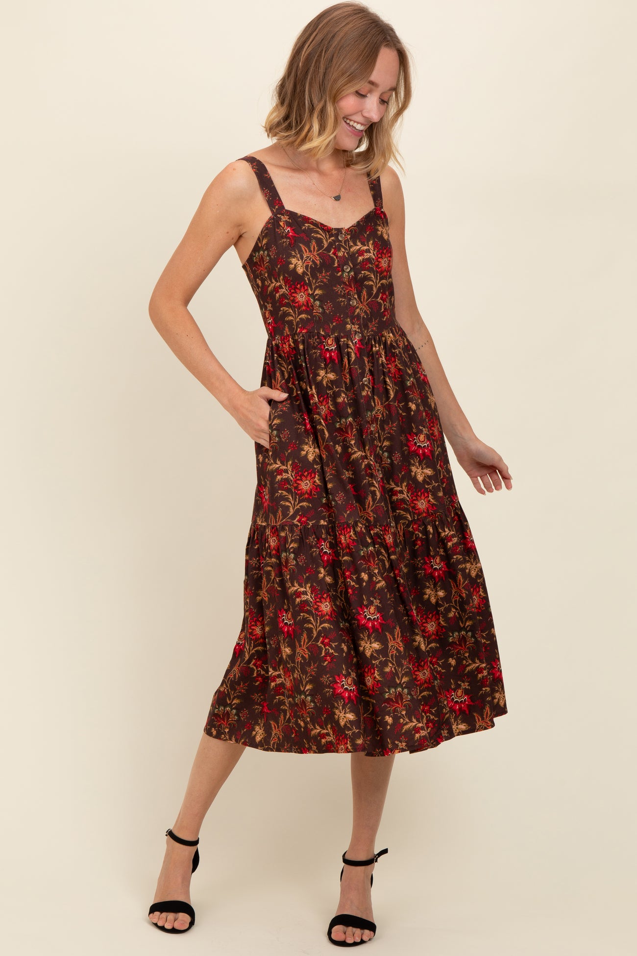 Brown Floral Sweetheart Neck Button Down Maternity Midi Dress