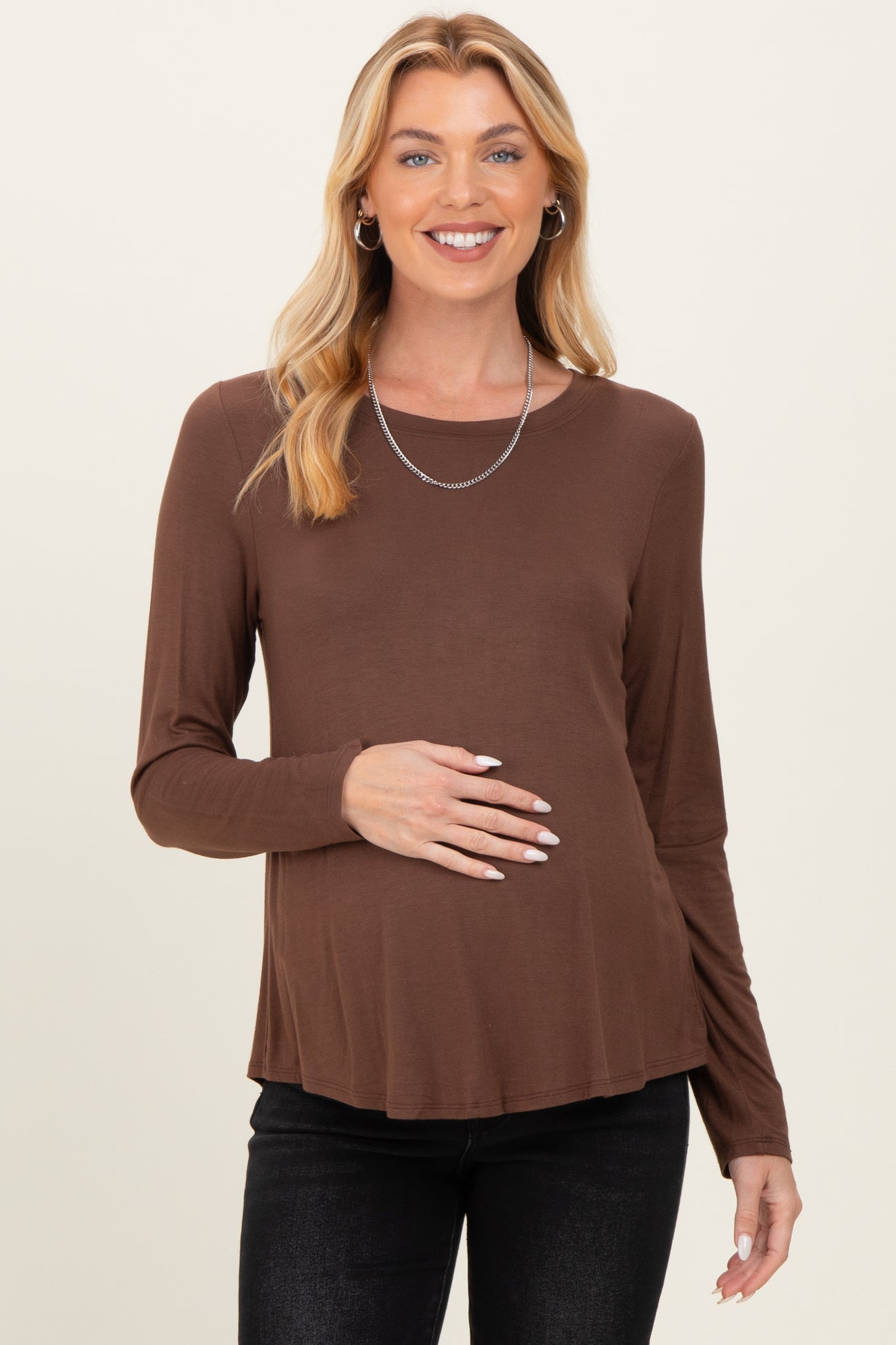 Brown Flowy Round Hem Maternity Long Sleeve Top