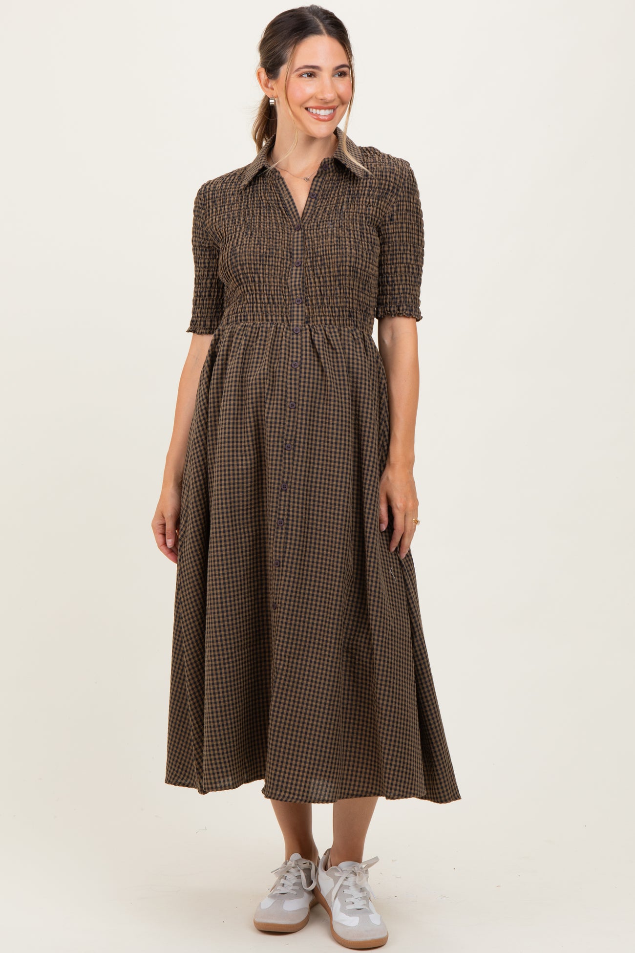 Brown Gingham Smocked Button Down Maternity Midi Dress
