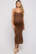 An open knit crochet maternity dress featuring adjustable straps and a scoop neckline. Dress is lined.