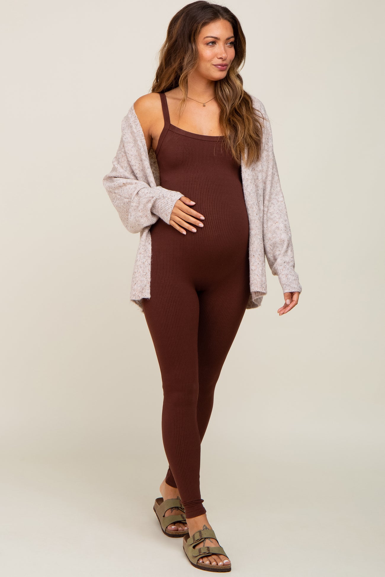 Brown Ribbed Sleeveless Maternity Jumpsuit