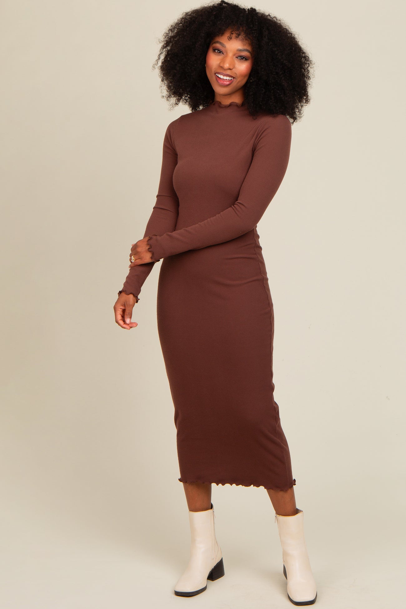 Brown Ruffle Mock Neck Long Sleeve Midi Dress