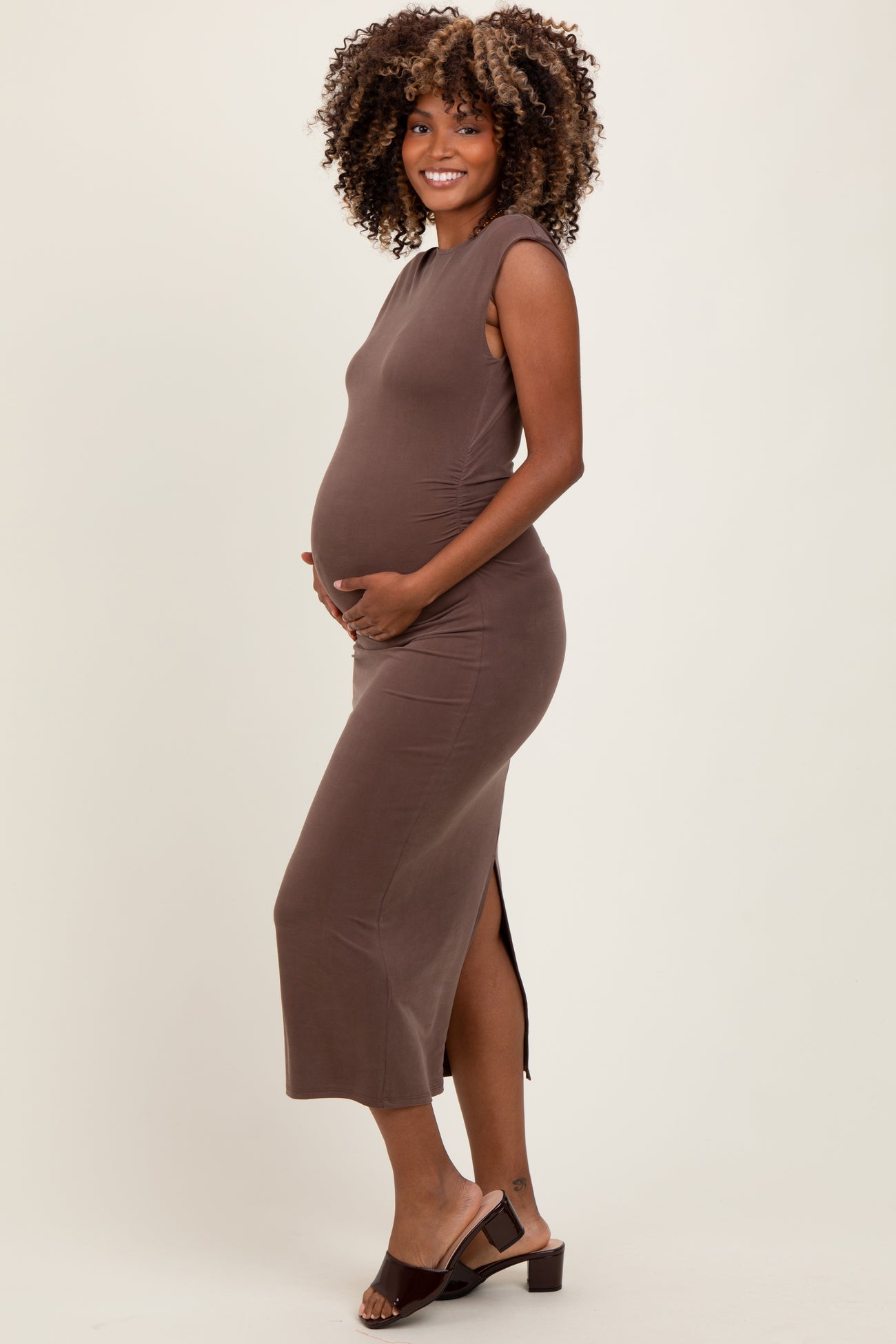 Brown Sleeveless Side Ruched Maternity Midi Dress