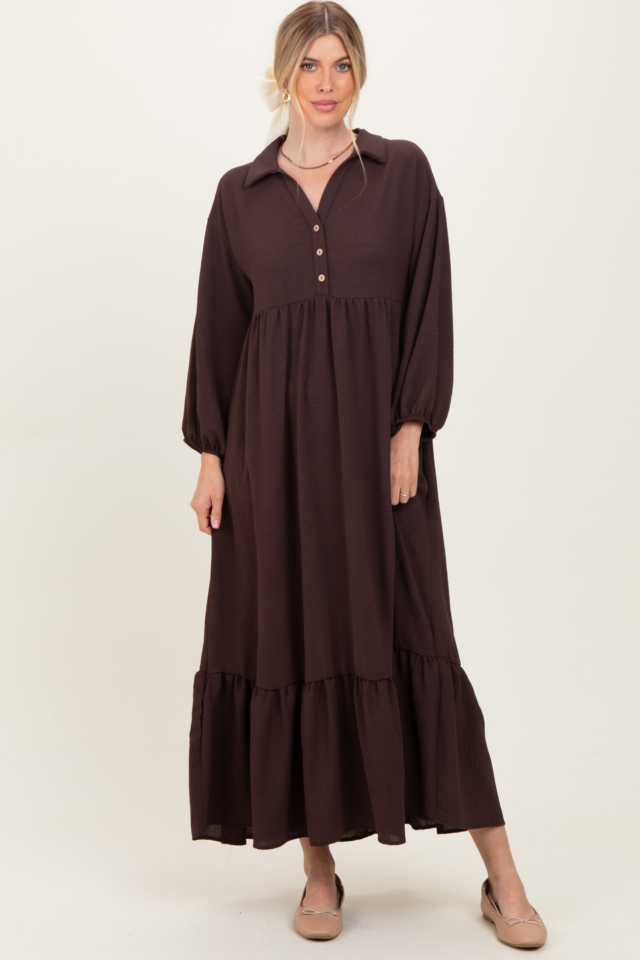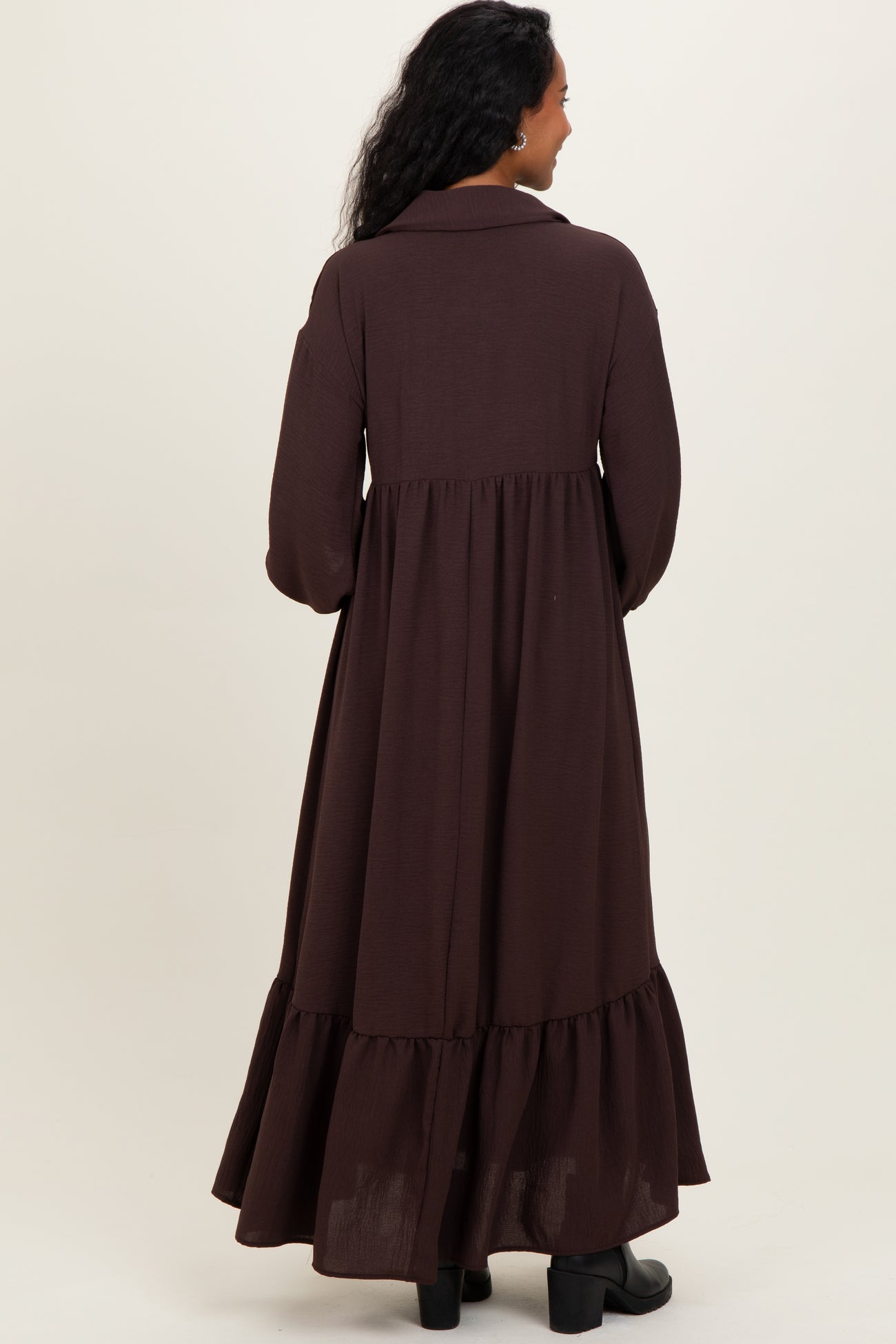 Brown Solid Long Sleeve Button Down Tiered Collared Maternity Dress