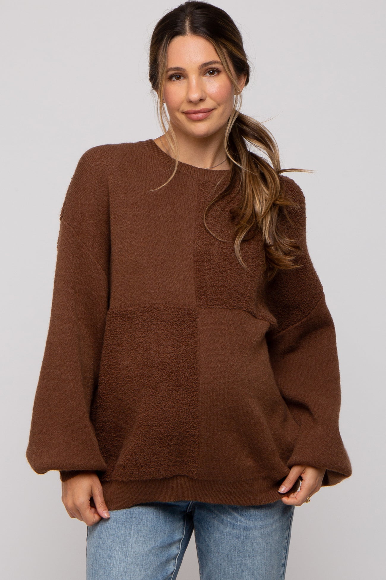 A checkered maternity sweater with a rounded neckline and long drop shoulder sleeves. Ribbed along the neckline, cuffs, and hem.