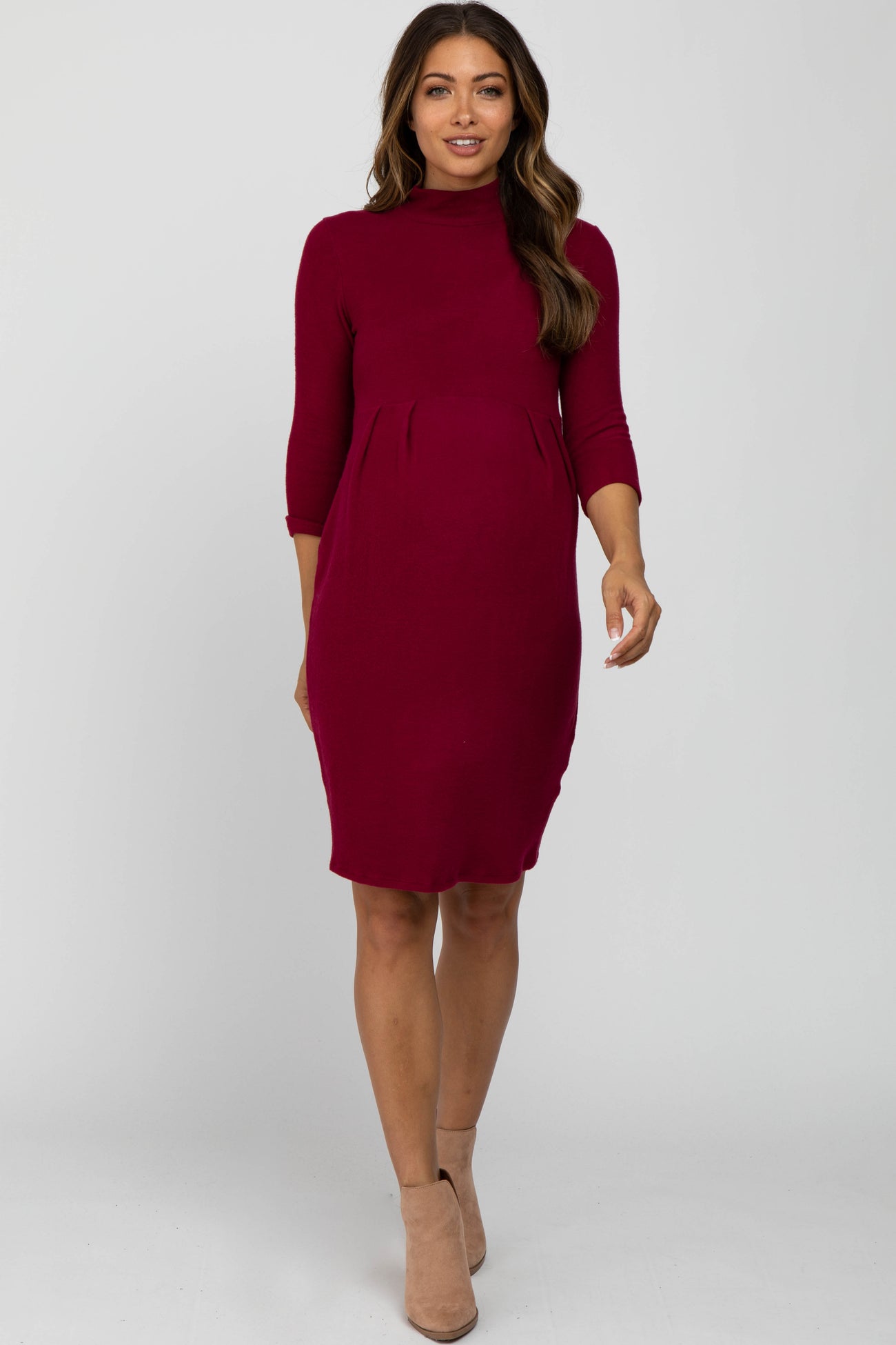 Burgundy Brushed Mock Neck Fitted Maternity Dress