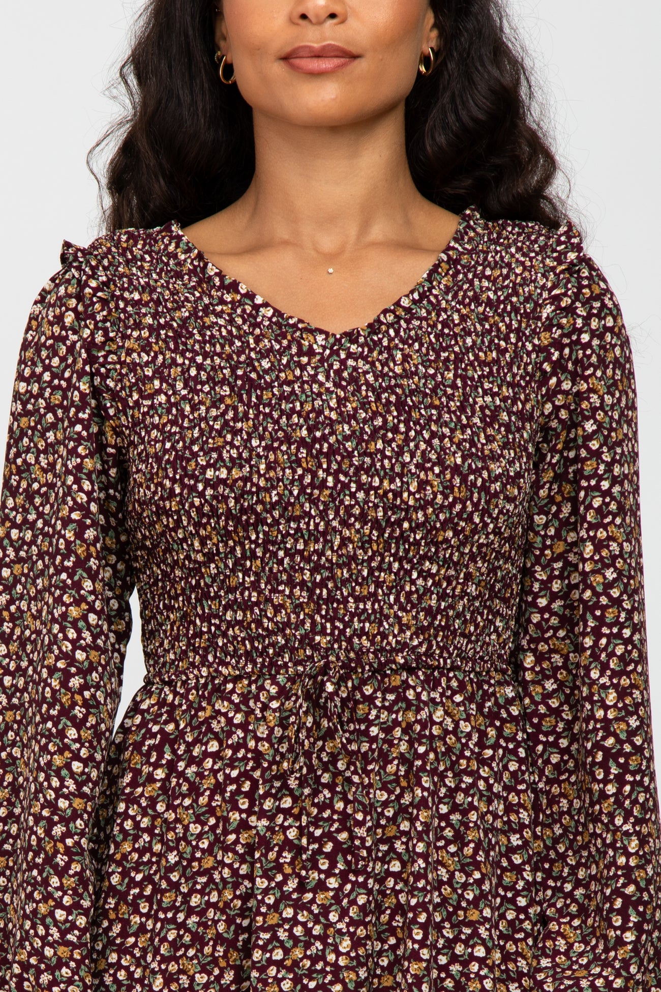 Burgundy Floral Long Sleeve Smocked Midi Dress