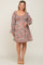 A floral print maternity plus size dress with a v-neckline, ruffle accent shoulders, long cinched sleeves, and a smocked bodice.