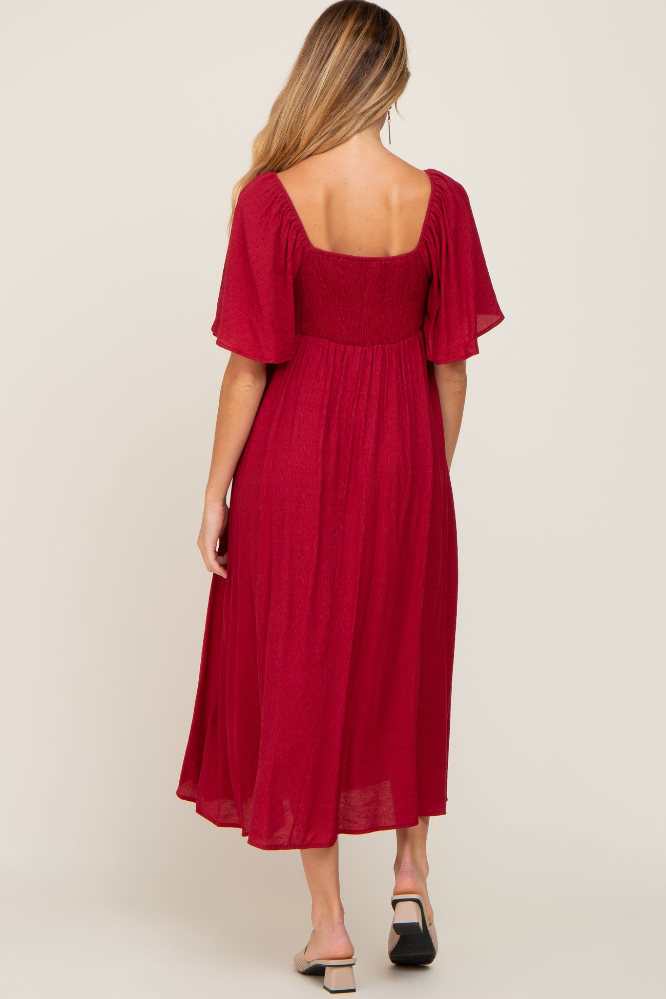Burgundy Front Tie Ruffle Sleeve Maternity Midi Dress